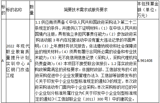 2022年现代职业教育质量提升计划实训中心A区钢门改造工程采购项目的潜在供应商应在烟台市高新区蓝海软件园D座10楼1012室获取采购文件,并于2022-08-22 09:30:00(北京时间)前提交响应文件。