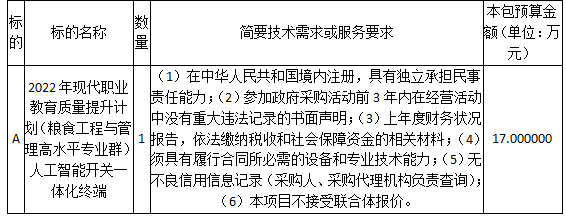 2022年现代职业教育质量提升计划(粮食工程与管理高水平专业群)人工智能开关一体化终端采购项目的潜在供应商应在烟台市高新区蓝海路1号D座10楼获取采购文件,并于2022-08-22 09:30:00(北京时间)前提交响应文件。