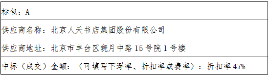 标包A:北京人天书店集团股份有限公司(100.0、100.0、100.0)、湖北三新文化传媒有限公司(94.54、95.54、97.54)、北京思得乐图书有限公司(92.92、95.92、95.92)、烟台法苑法律图书有限公司(92.73、93.73、95.73)、安徽时代出版发行有限公司(95.73、97.73、97.73)、山东泽儒文化传媒有限公司(98.73、98.73、98.73)、安徽新华传媒股份有限公司(94.73、95.73、95.73)、北京书香盛景文化发展有限公司(93.13、95.13、95.13)
