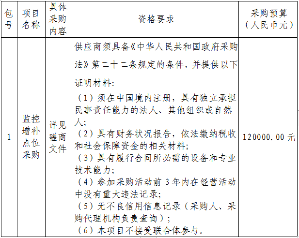 四、采购项目分包情况:监控增补点位采购及相关服务;完成期限:自接到采购人通知后20日内供货安装调试完毕并验收合格;本项目划分为1个包。