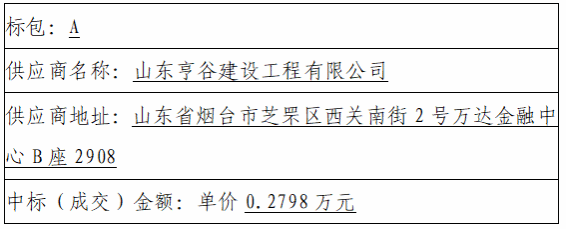 标包A:山东亨谷建设工程有限公司(91.0、93.0、94.0)、烟台市飞和建筑工程有限公司(83.83、86.83、87.83)、烟台市阳光装饰安装工程有限公司(83.87、85.87、85.87)