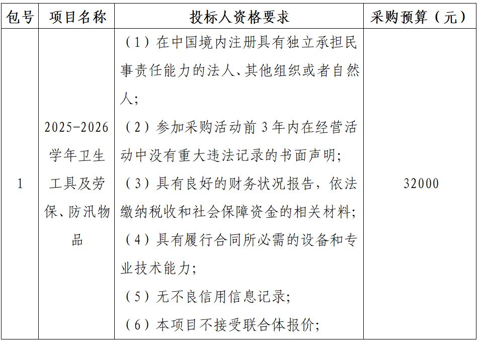 采购内容:2025-2026学年卫生工具及劳保、防汛物品;本项目划分一个包;