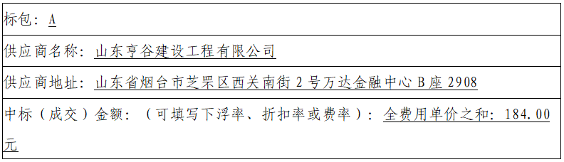 标包A:山东亨谷建设工程有限公司(87.5、90.5、94.0)、烟台永盛建筑开发有限公司(81.71、85.71、85.71)、山东鼎晟装饰工程有限公司(78.18、81.68、83.18)