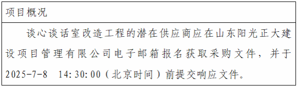 3.方式:电子邮箱报名。须将加盖单位公章的营业执照(或事业单位法人证书等相关证明材料)、汇款证明(开户名称:山东阳光正大建设项目管理有限公司烟台分公司,开户银行:恒丰银行股份有限公司烟台解放路支行,账号:37250101150100000391)、所报项目名称、项目编号、项目联系人、联系方式发送至邮箱sdygzdyt@163.com。根据山东省政府采购有关规定,凡有意参加本次政府采购的供应商必须在2025年7月2日17时30分(北京时间)前在中国山东政府采购网上进行注册、报名,注册并报名成功后,再按照电子邮箱报名程序获取磋商文件。供应商未按上述要求注册报名并向代理机构登记备案购买磋商文件导致无法参加的,由供应商自行承担相应后果和责任。报名电话:0535-6898911。