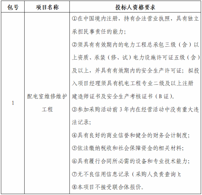 采购内容:配电室维修维护工程;本项目划分一个包;