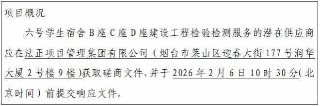 采购需求:本项目为六号学生宿舍B座C座D座建设工程检验检测服务,共分为1个采购包。具体要求详见磋商文件第二部分采购内容及相关要求。