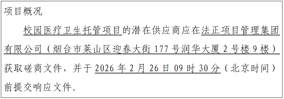 采购需求:本项目为校园医疗卫生托管项目,共分为1个采购包。具体要求详见磋商文件第二部分采购内容及相关要求。