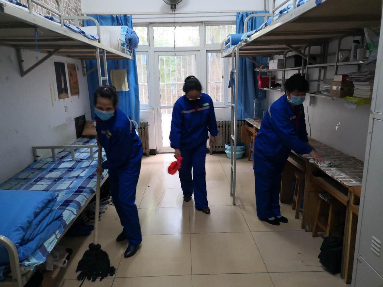 为保证学生住宿安全,营造健康环境,公寓管理中心安排人员在返校前对公寓公共区域和全部宿舍进行全面的消毒、清扫和通风,对公共卫生间进行了彻底消毒清洁。选取通风条件好、人流经过少的80个宿舍,协同各系搬迁,进行消毒打扫,布置为临时留观点。为防止学生测温时聚集,公寓工作人员买来自喷漆,制作模具,在所有公寓划设进出通道、“一米提醒线”。拟订疫情防控期间公寓生活明白纸,让学生一看就清楚。