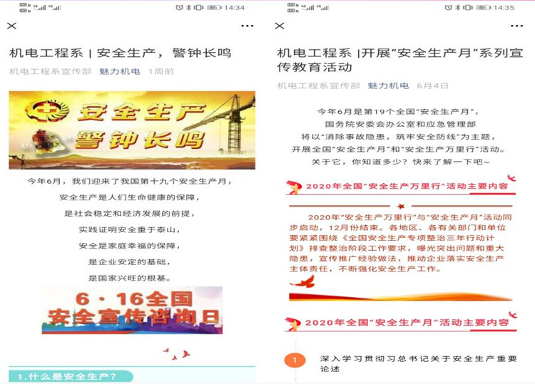 本站讯 2020年6月是全国第19个“安全生产月”,机电工程系以“消除安全隐患、筑牢安全防线”为主题,扎实开展“安全生产月”系列活动,从根源上消除安全隐患,持续夯实校园安全基础,全面提升本质安全水平,促进系部安全管理水平提升,不断增强师生获得感、幸福感、安全感,营造良好的校园安全环境。