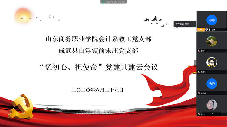 本站讯 6月29日下午,会计系教工党支部与成武县白浮图镇前宋庄党支部联合召开“忆初心、担使命”党建共建云会议。成武县前宋庄村支部书记陈根喜、第一书记崔立升及会计系教工党支部书记邹婷、全体委员、党小组长参加了会议。