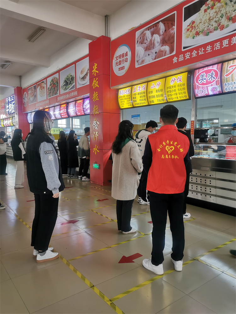 餐厅就餐时间人流量大,安全问题不容小觑。为保障同学们的用餐安全,入党积极分子们在就餐高峰时间准时到岗,提醒同学们带好口罩,保持一米间隔线,同向就餐,有序进出食堂,确保食堂就餐队伍井然有序,织密“疫情防护安全网”。