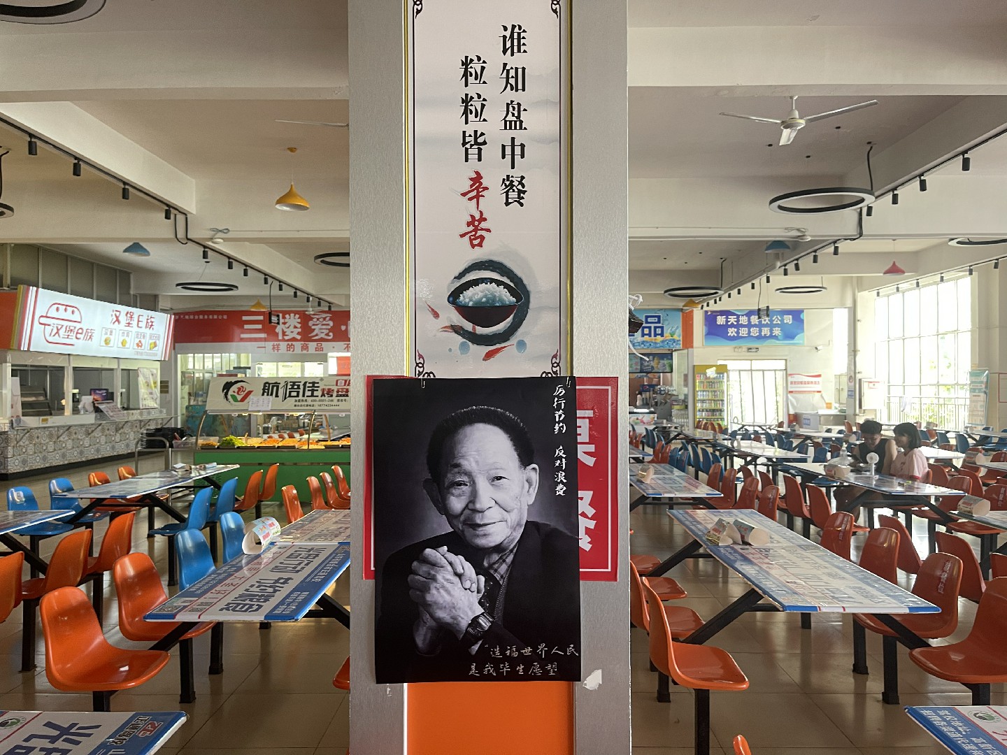 节约粮食不仅是中华民族的传统美德,更是每个公民的责任和义务。为缅怀袁隆平院士,进一步增强学生的爱粮节粮意识,学生食堂就餐大厅的广播、随处可见的海报,时刻提醒着同学们“节约光荣、浪费可耻”。同学们纷纷表示,“节约粮食就是对袁隆平爷爷最好的缅怀”“缅怀袁隆平院士就是要赓续袁老精神,努力学习、扎实钻研,用汗水诠释青年人的使命与担当”。