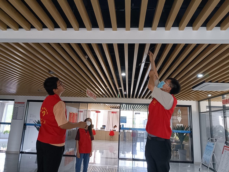 本站讯 为庆祝中国共产党成立101周年,扎实推进“双报到”工作,适应党建引领城市基层治理的新形势新要求。7月1日,信息工程学院高元杰、王正臣老师带领“红蓝”青年志愿者服务队,深入海兴社区开展“双报到”活动,充分利用专业优势,为社区居民志愿服务。