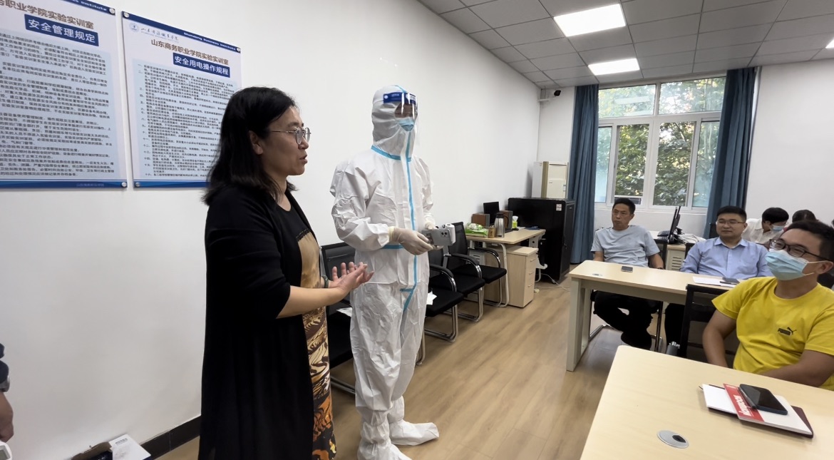 本次演练分两组场景:教室和宿舍应急处置。演练前由学院党总支书记肖永霞为大家讲解了如何穿脱防护服。演练过程中,参演人员模拟了教学过程中学生自感体温异常的应急处置程序,认真做好了任课老师暂停教学、任课老师打电话给辅导员告知学生情况、辅导员电话联系疫情防控领导小组办公室、安排医护人员到现场处置、辅导员到达教室后将学生引导至所在教学楼的临时留观点等候医护人员、任课教师维护教室秩序、安抚学生不要恐慌、组织登记周边5米内学生信息等各项应急处置措施,整个演练过程反应迅速、井然有序。