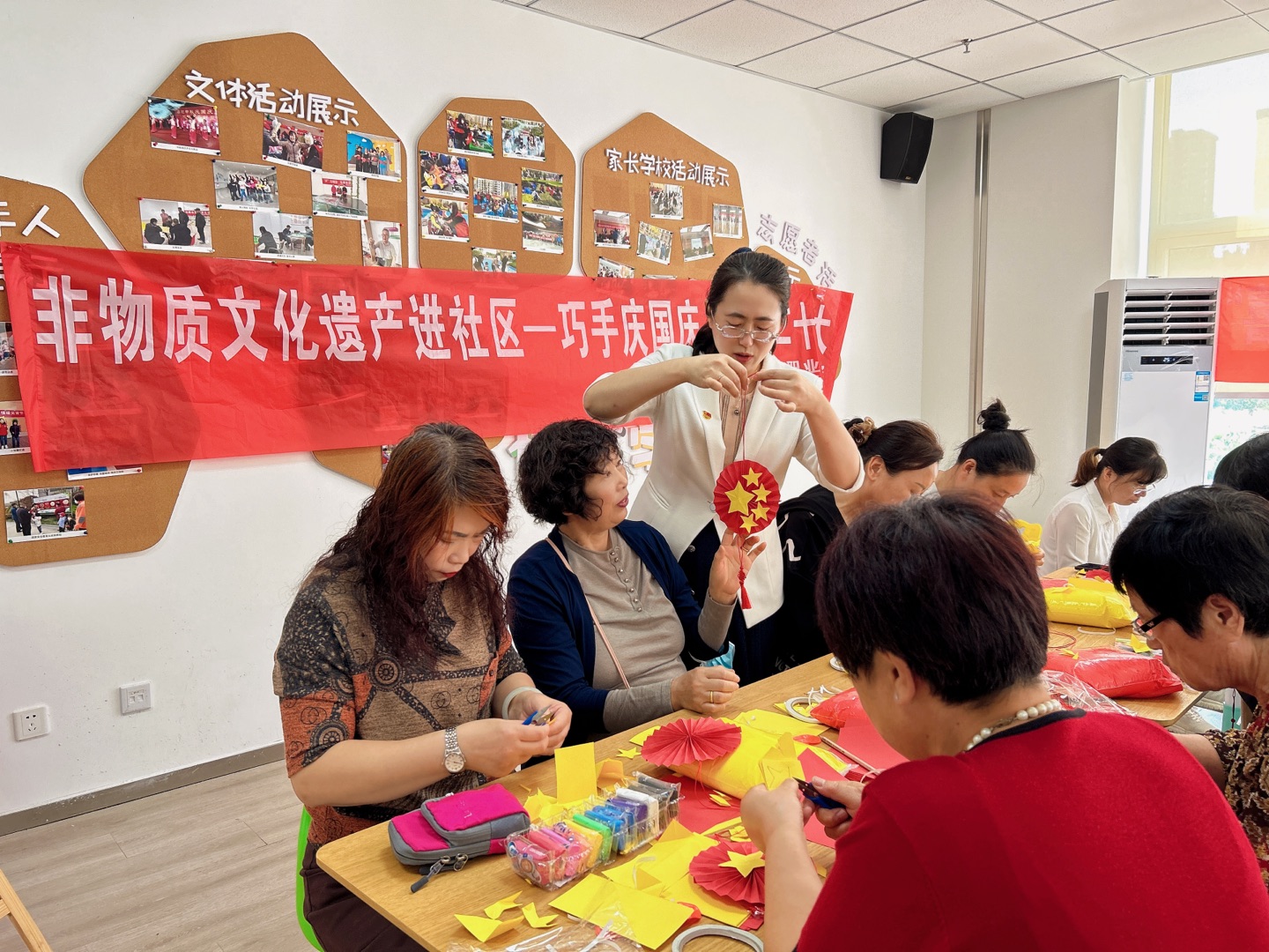 此次活动主要包括剪纸和泥塑两个部分。剪纸是中国古老的民间艺术之一。活动现场,通过老师们对剪纸的纹样处理、特点把握等技巧的细致讲授,社区居民们手中的红纸就变成漂亮的国庆挂件,现场弥漫着喜悦的氛围,手心里一张薄薄的剪纸,传递着一份浓浓的情怀,表达了大家对祖国繁荣富强的美好祝福。