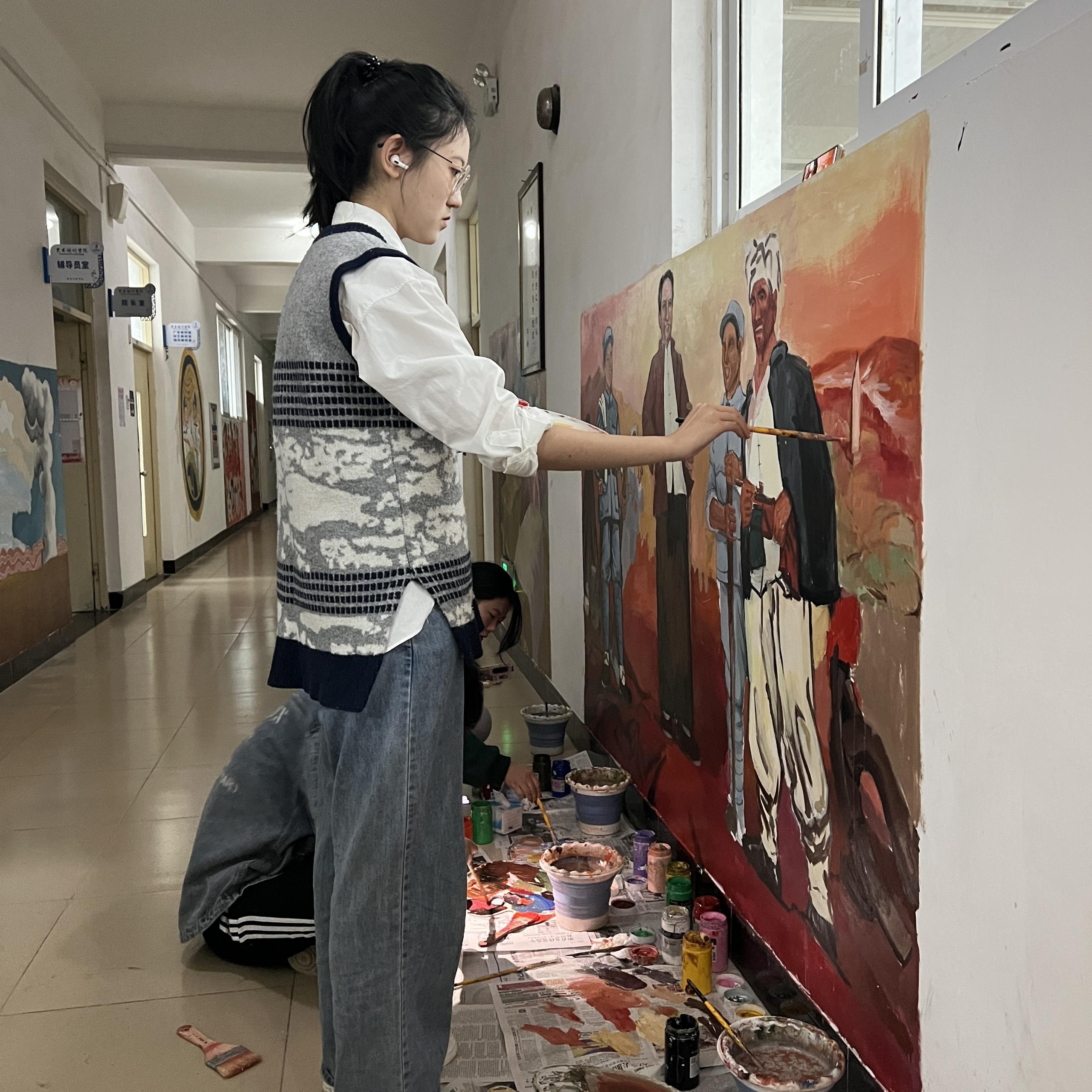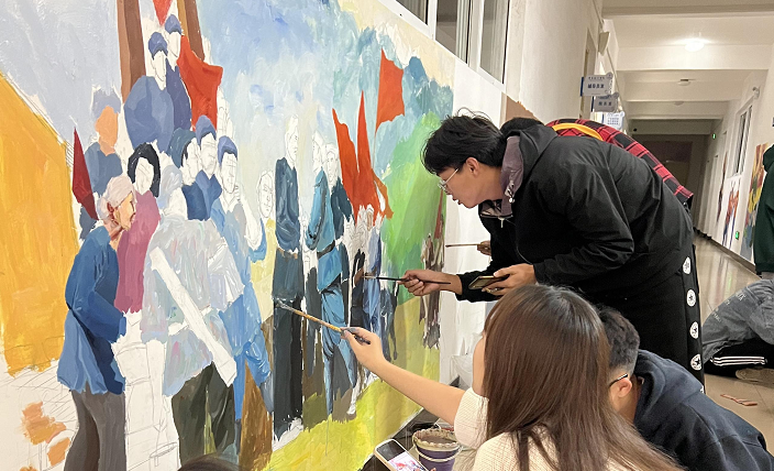 本站讯 为引导广大青年学生树立崇高理想信念,厚植爱党爱国情怀,艺术设计学院组织开展“传承中国精神,打造彩绘长廊”活动。艺术学子以笔为媒、以画传情,用色彩传递爱党爱国热情,为党的二十大胜利召开献礼。