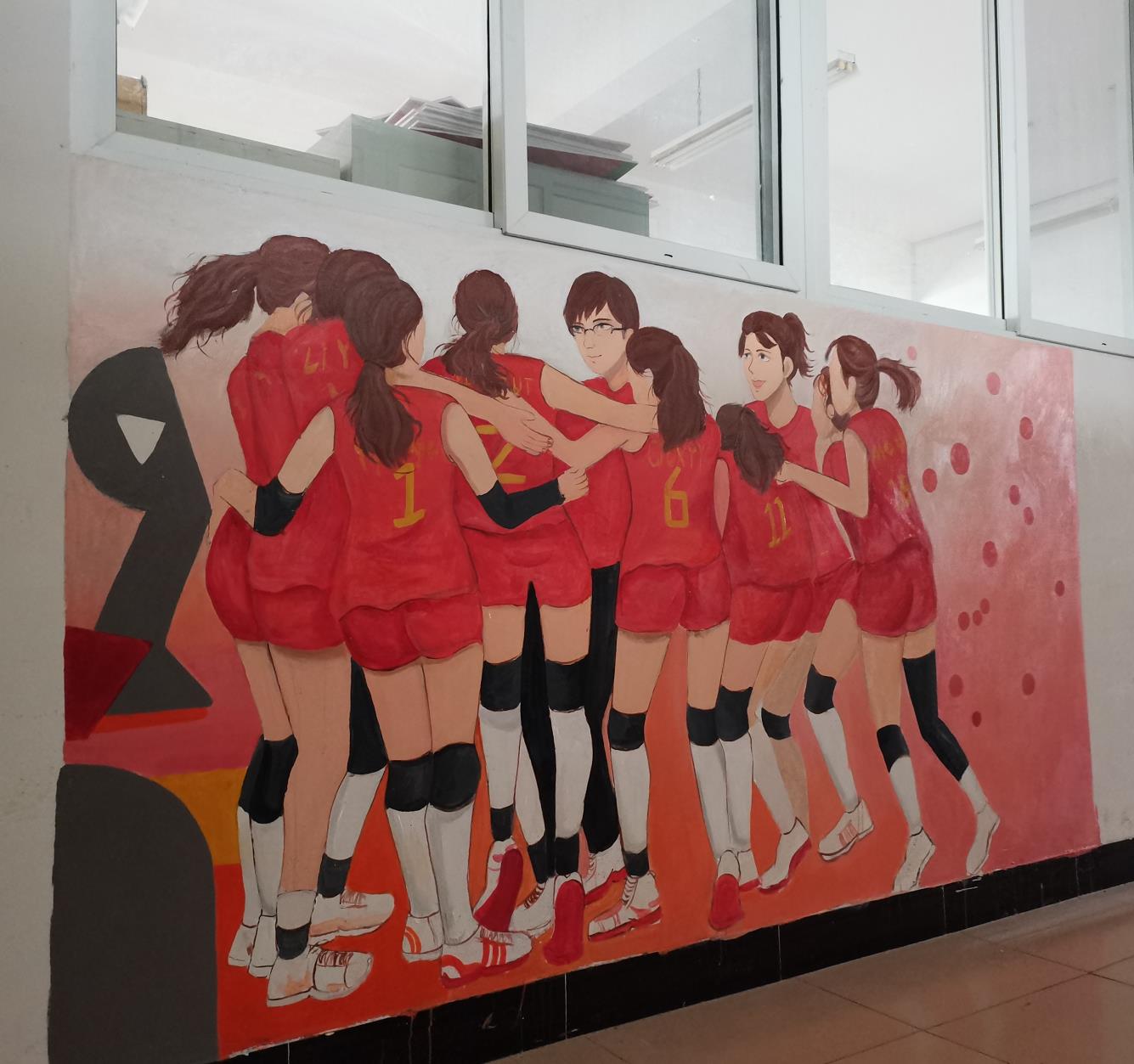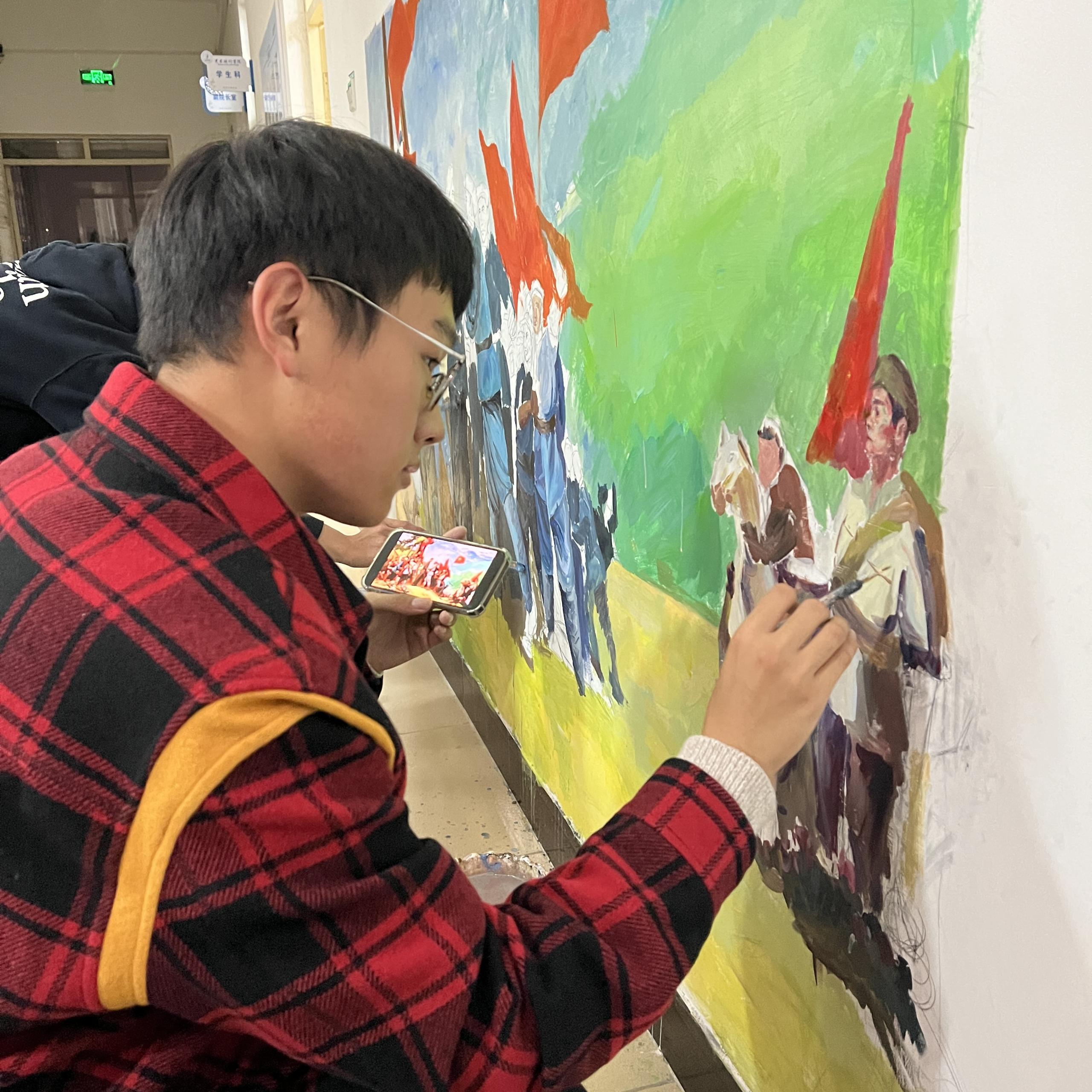 本次墙绘选取红船精神、井冈山精神、长征精神、延安精神、西柏坡精神、沂蒙精神、“两弹一星”精神、雷锋精神、载人航天精神、抗震救灾精神、中国女排精神、劳模精神、抗疫精神等13种中国精神进行创作。30余名艺术学子利用课余时间,经历构思、构图、起稿、描图、修整、上色等过程,以课本插画和卡通画相结合的手法,耗时一个月时间完成13幅作品。参与墙绘活动的学生谈到:“用画笔呈现中国精神的过程中,加深了我们对中国精神的认识和了解,使我们懂得中国精神是中华民族在波澜壮阔奋斗历史中传承下来的精神力量,激励我们在新时代要努力成为实现民族复兴的先锋力量。”
