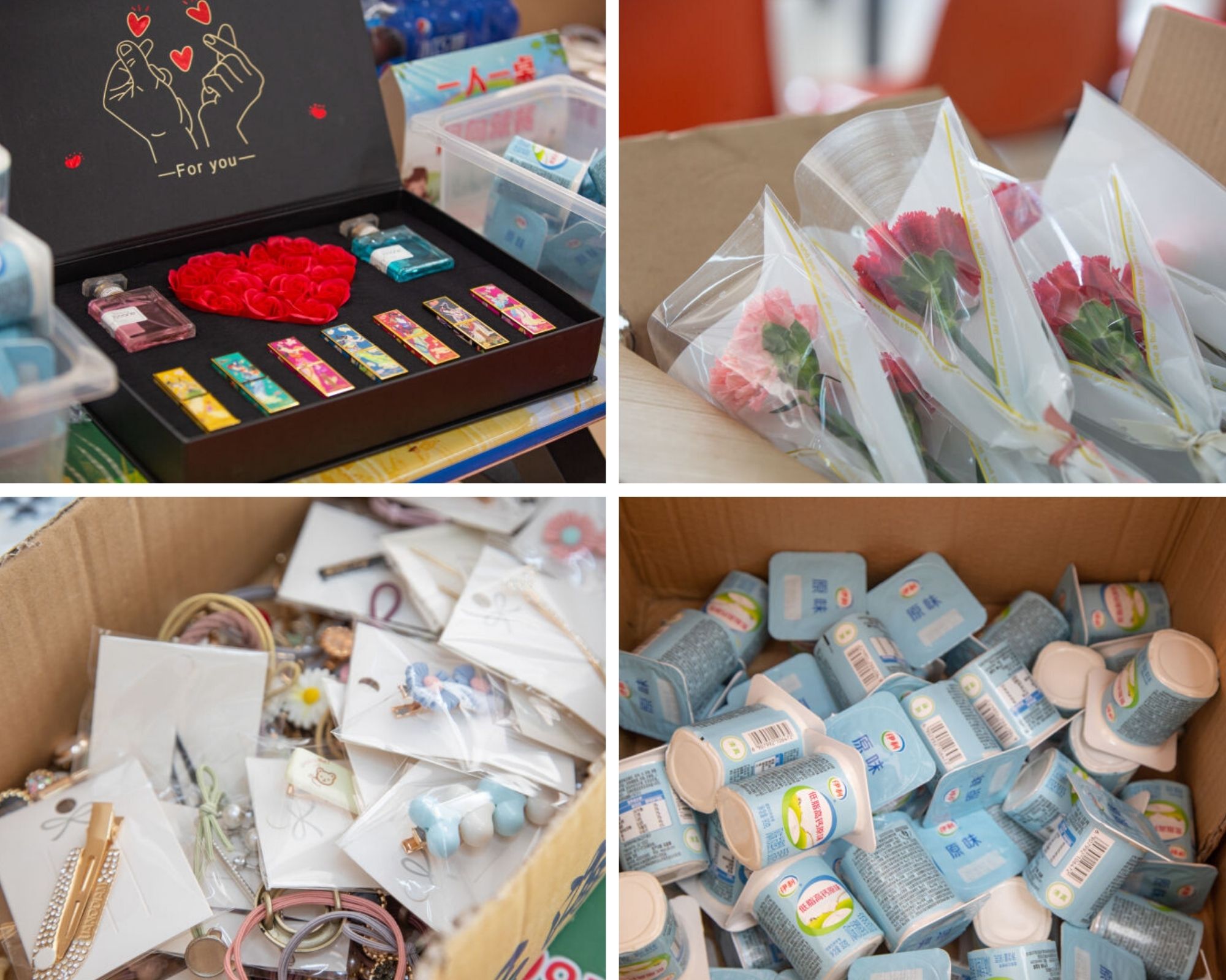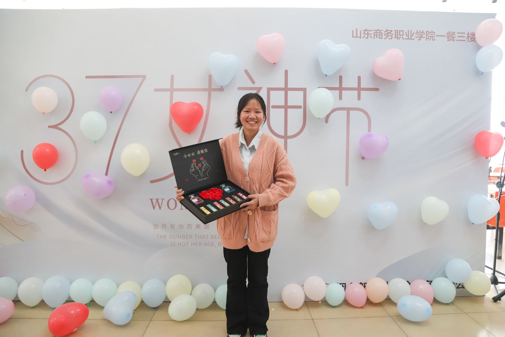 精致化妆品礼盒、发卡、鲜花、酸奶、小零食等,丰富的礼品以转盘抽奖形式送给前来消费的学生们。抽奖活动开展不到半小时,人群中忽然响起一阵掌声,来自文化旅游学院22级的一位女同学赢得了一等奖奖品精致化妆品礼盒一个。同学兴奋的说:“在这样的节日里,收到来自学校的礼物,很开心也很感动!”