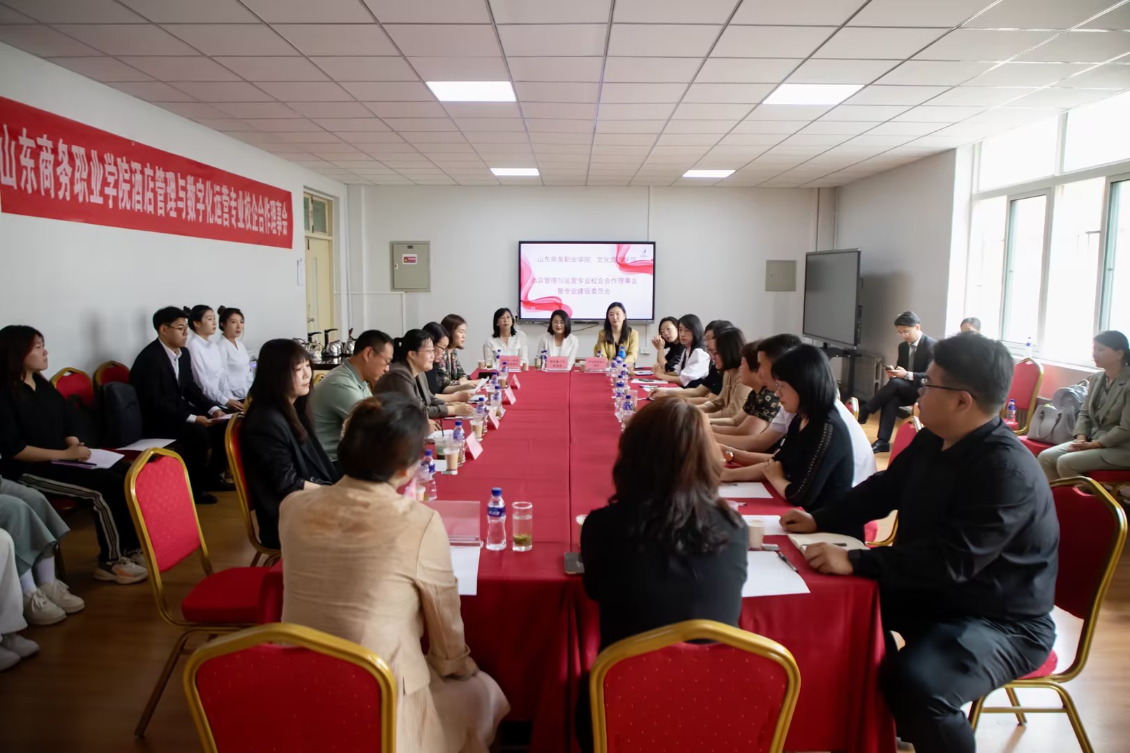 立足专业,精准拓岗,推进校企互利共赢。北京博苑未来管理顾问有限公司、山东开慧教育科技集团有限公司、山东舜和酒店有限公司、山东良友富临酒店管理有限公司、烟台百纳餐饮有限公司等30余家专业对口企业代表出席校企合作理事会交流会,双方就专业建设、人才培养、产业需求及产教融合等方面进行了深入交流,探讨建立全方位、深层次、多形式的合作机制与平台,实现校企资源共享、优势互补、互利共赢。