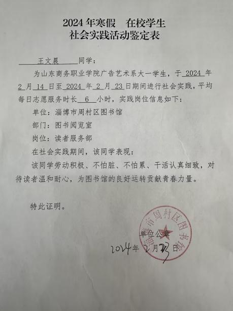体验劳动之乐,感受实践之美。作为引领新时代的青年,要弘扬“奉献、友爱、互助、进步”的志愿精神,走出校园接触社会,用实际行动响应党的号召,在服务群众、奉献社会中收获成长和进步。23广告二班王一斐同学积极参与招远金太阳志愿服务中心活动,大年三十至西山老年公寓为留守老人献上舞蹈戏剧小品等多项文艺节目,包饺子、扫卫生,在照顾、陪伴老人的同时送去温暖与关爱;23广告1班王文晨同学参与到淄博市周村图书馆的志愿服务活动中,完成图书上架、整架借还、读者咨询、阅读导引、维持秩序等工作,每日工作时长达6小时,用行动赢得图书馆和读者的一致好评。