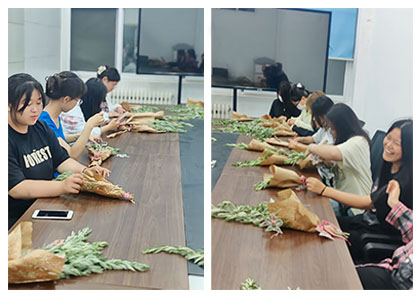 学院组织同学们用包装纸将新鲜采摘的艾草捆扎成束,添上精心准备的装饰品,写上美好的祝福语,再打一个漂亮的蝴蝶结,一束精美的艾草花束就呈现在眼前。空气中弥漫着悠悠的艾草香,每一缕香气都承载着深深的思念与祝福,大家交流着各地关于端午的故事和习俗,共同感受传统节日里蕴含着的深厚文化气息。此次活动将优秀传统文化融入校园生活,促进了师生间的交流,增进了师生间的友谊,营造出健康向上的良好文化氛围。