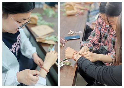 五彩绳,是端午节的吉祥物兼饰物,具有辟邪、祈福纳吉的美好寓意。学院组织五彩绳编织活动,邀请专业艺人现场教学,指导同学们动手编织五彩绳。“先将线绳对折,搓拧,手指勾起......”大家认真观看,仔细学习,不一会儿,一条条精美的五彩绳就做好了。同学们将做好的五彩绳佩戴在朋友的手上,表达对朋友的美好祝愿。活动让同学们在动手编织中感受节日的文化魅力,丰富了同学们的生活体验,增进了同学们的情感交流。