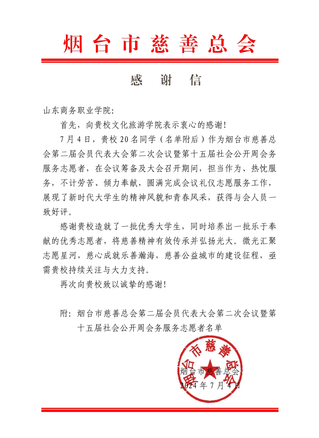 会后,烟台市慈善总会发来感谢信,一方面肯定了文化旅游学院志愿者们担当作为、热忱服务、不计劳苦、倾力奉献的优秀品质;另一方面感谢学校培养了一批优秀大学生和一批乐于奉献的优秀志愿者,将慈善精神有效传承并发扬光大。