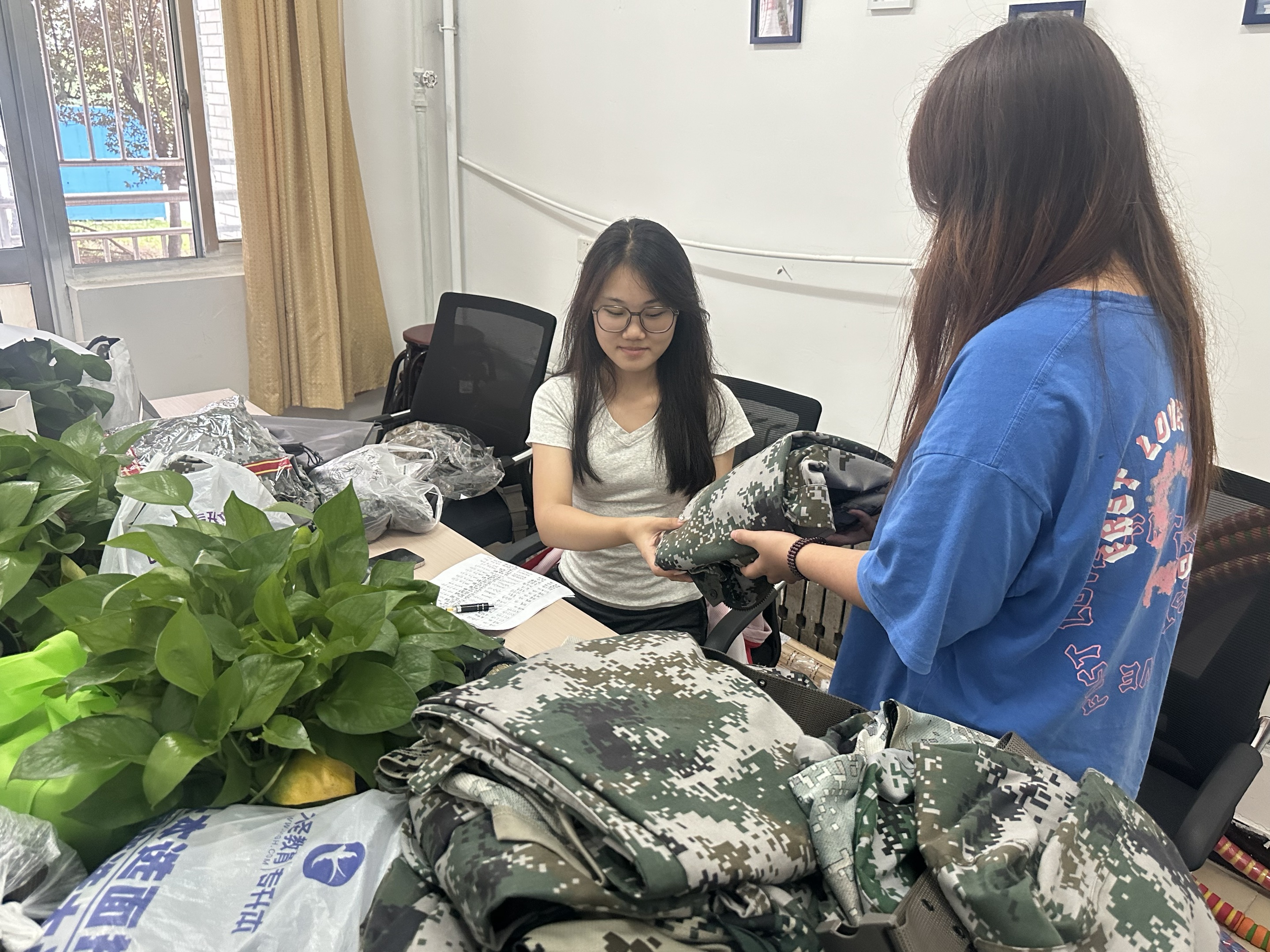 活动一经发起,便迅速点燃了新生们的热情。他们将个人的军训服细心清洗、整理,带着满满的诚意与祝福,将其捐赠。捐赠现场,一件件军训服整齐排列,每一件都承载着捐赠者的温暖故事。更有新生亲手写下鼓励的话语,贴在军训服上,希望这份爱心能够传递给更多需要帮助的人。