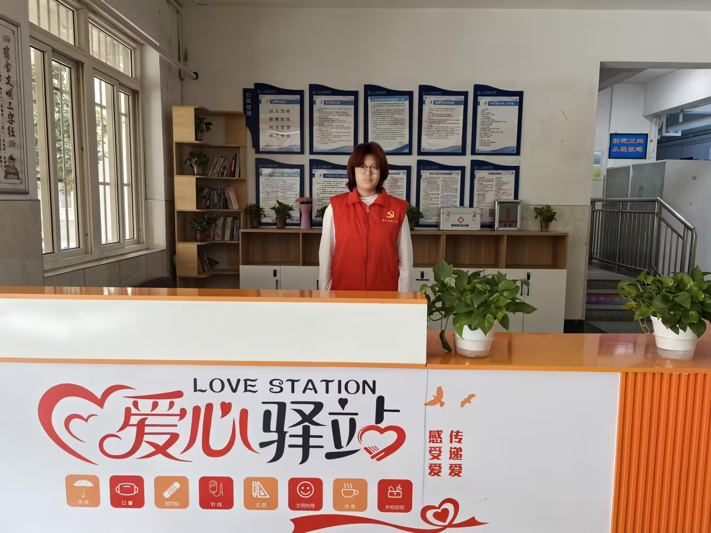爱心驿站位于尚仁苑C栋学生社区一楼大厅,地理位置优越,便于学生快速便捷地获取所需帮助。驿站内部分区明确,功能齐全,主要包括心理辅导、问询服务、应急物品供应及学习辅助四大板块,全方位满足学生的日常需求和精神支持。