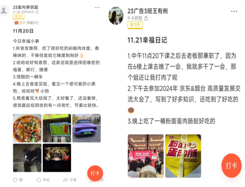 开展21天幸福打卡活动。活动聚焦校园生活,每天记录生活中让自己感到幸福的三件小事,通过平凡生活的不凡之处,展现大学生活的美好与活力,激发广大学子积极拥抱大学生活,养成正向积极的思维习惯。有同学写道:“经过21天打卡,使自己养成了随手记录生活中美好小事的习惯,这是自己以前从没尝试过的。参加幸福打卡,让自己成就感满满。”