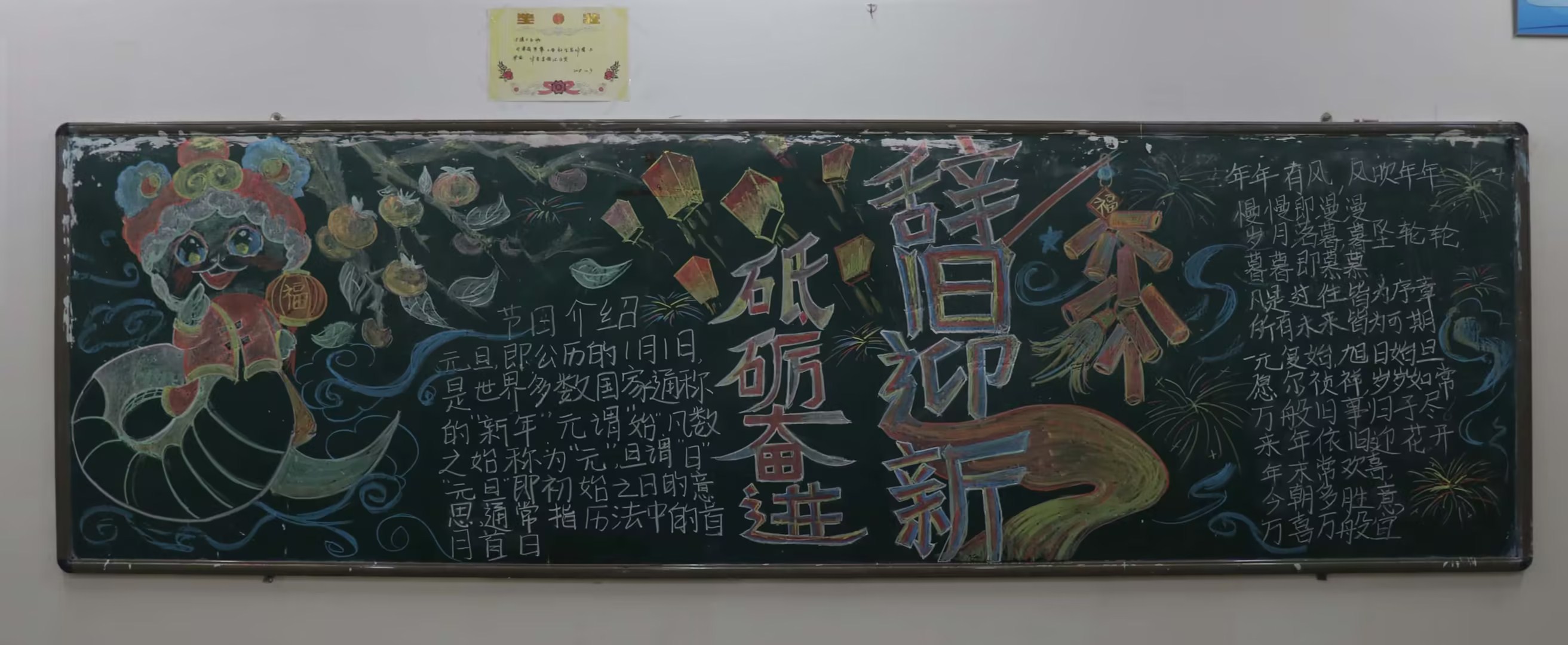 经过数天精心创作,一些班级精心装扮了喜迎元旦的黑板报。有的用绚烂色彩勾勒出金蛇戏珠与红灯高挂的画面,有的以立体剪纸风格展现爆竹声声迎新年的热闹。24设计2班以金蛇盘绕为主线,周围点缀传统红灯笼,将传统文化与生肖元素巧妙融合,展现出对新年的美好期许。24建工1班将爆竹元素与灯笼线条结合,用细腻笔触描绘出高空爆竹绽放的场景,寓意学院在新的一年如爆竹般蓬勃发展。