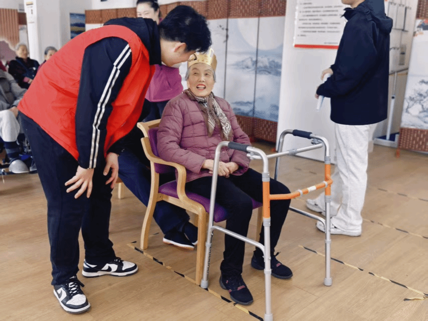 早上八点半,学生们伴着温暖的阳光步行到达养老院,工作人员正在为当天过生日的五位老人筹办生日宴。几名同学在工作人员的指导下全身心投入到工作当中。与此同时,其他同学来到老人的房间,有的推着轮椅、有的搀扶着他们前往生日会活动现场,一路上笑语不断,亲密无间。伴随着欢快的生日歌旋律响起,全场气氛被推向高潮,同学们陪伴老人一起拍手唱和,歌声悠扬婉转,在养老院的每一个角落回荡。