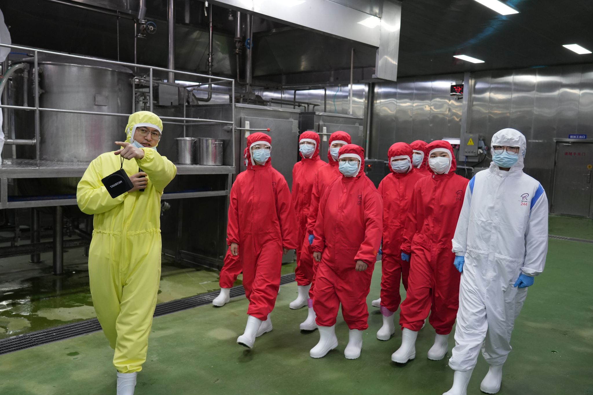 在工作人员的引导下,师生们换上红色安全服,全副武装,以“准员工”的标准开启馅料生产探秘之旅。从原料筛选到馅料炒制,再到产品检验检测,每一道工序环环相扣,每个细节都关乎食品安全。“员工的严格操作与机器的精准配合,原来智能化不是替代人工,而是让匠艺更精准。”23食检2班王雯月同学在参观后说道。23食安1班冯佳慧同学激动地表示:“非常开心能够来到企业参观,通过实地观察学习,让抽象的专业知识变得可触可感。”