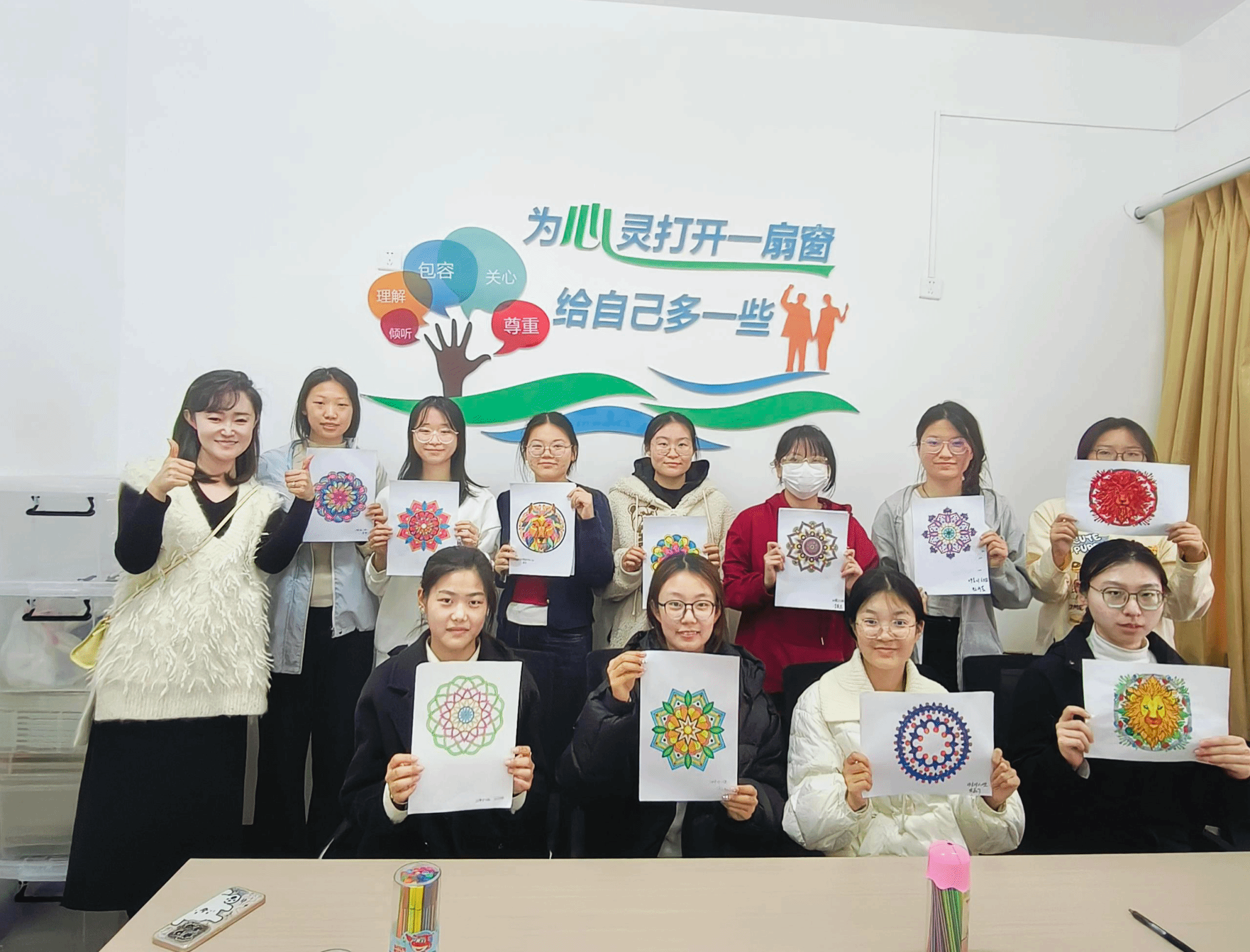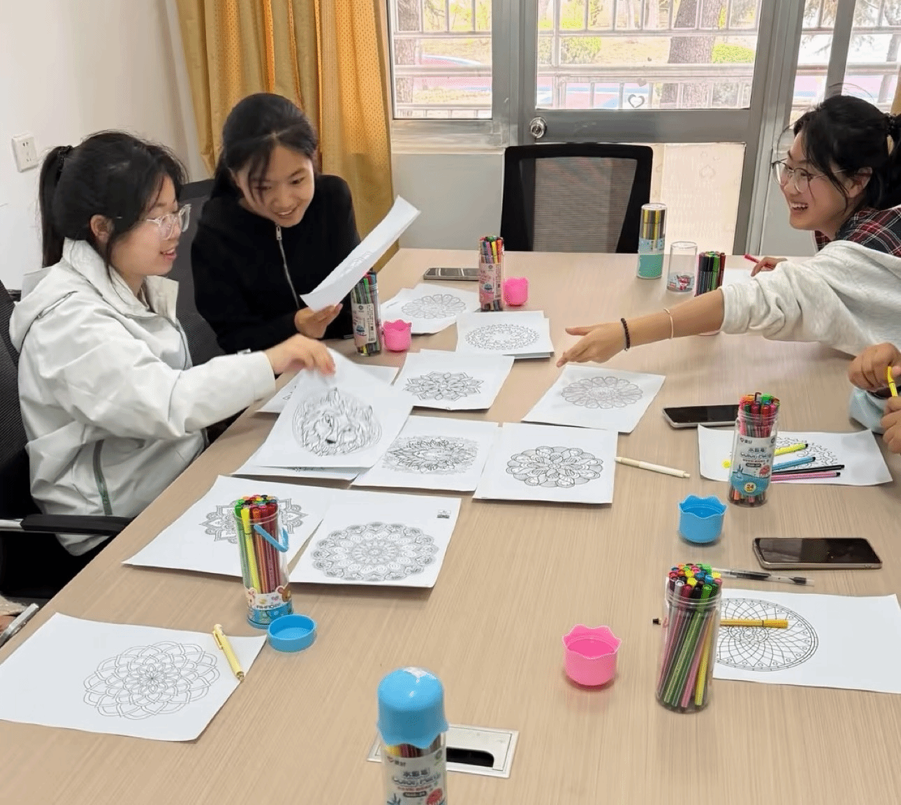 此次活动形式新颖,曼陀罗绘画作为一种艺术性表达,被视为科学有效的自我疗愈工具。学生在为曼陀罗图案轮廓涂色时,依据内心感受,自由选择颜色和图案,借此将内心的焦虑、紧张等情绪释放出来。
