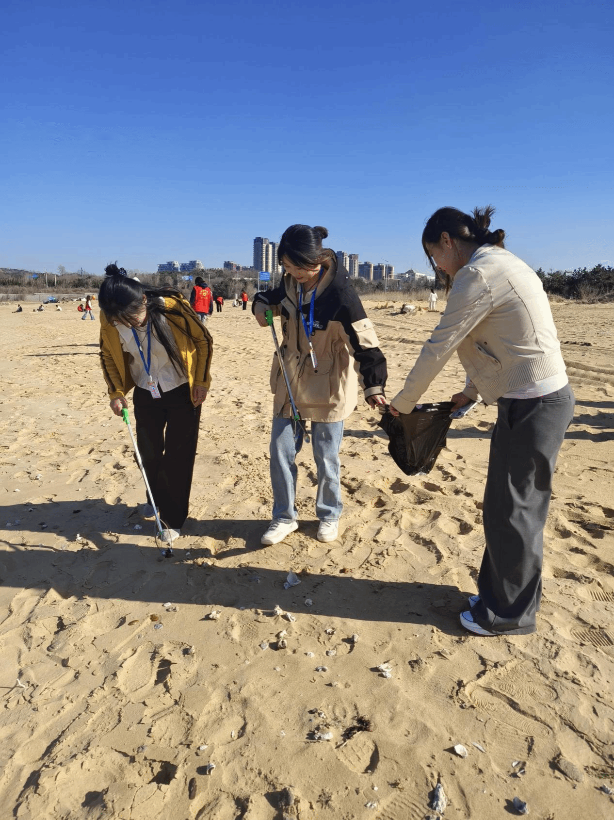 净滩护海,守护蔚蓝海岸线。组织50余名志愿者前往烟台市自然博物馆附近沙滩开展“净滩行动”。活动当天,海风凛冽,但志愿者们的热情丝毫不减。他们手持夹钳和垃圾袋,沿着海滩清理塑料瓶、废纸、泡沫等海洋垃圾,并分类投放至回收点。此外,志愿者们还根据事先搜集整理的相关资料信息,向周边游客宣讲微塑料污染的危害,呼吁公众减少一次性用品使用。此次净滩行动不仅改善了海滩环境,更让学生们学习到环保的重要性。