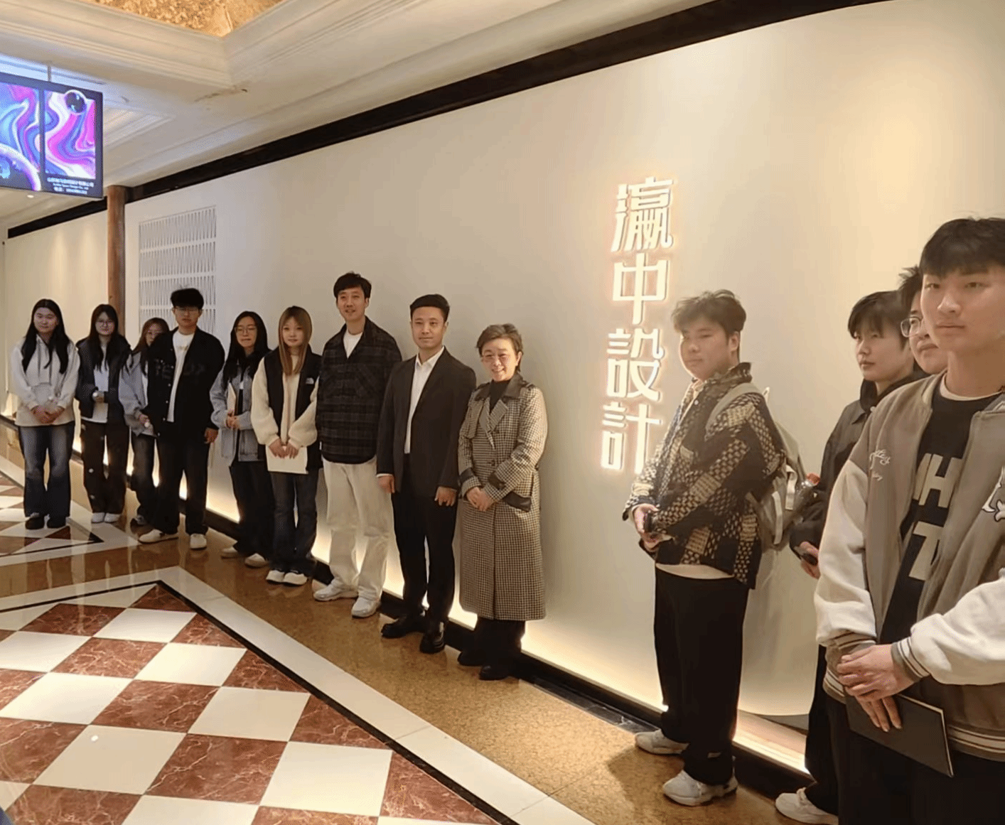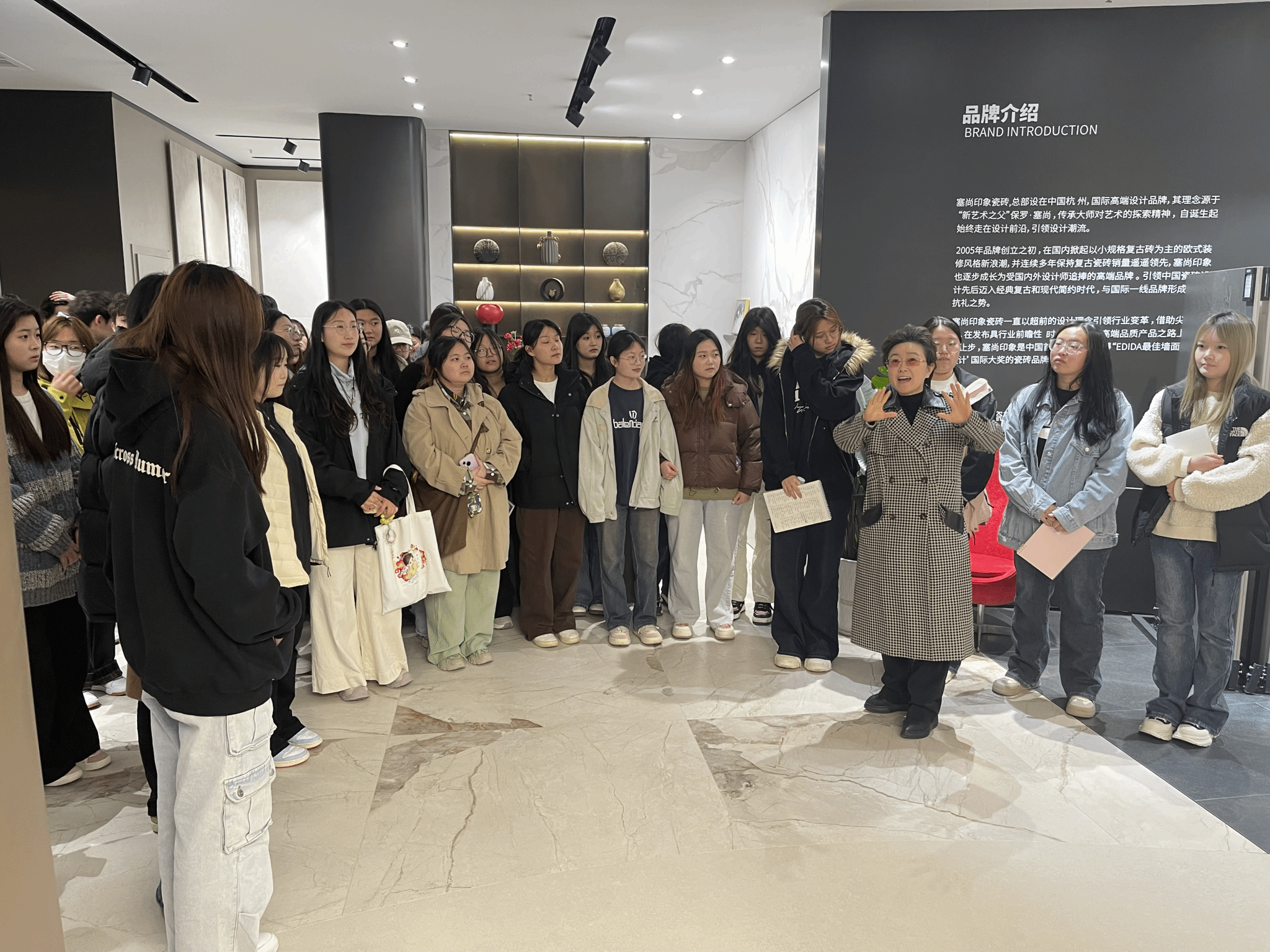 在实践中提升设计能力。在红星美凯龙建材馆新中源陶瓷展馆,烟台视觉旋律室内设计有限公司创始人刘晓峰通过“暗调设计”主题解析建材选型与空间美学的融合逻辑;IF造物中心总经理张珊珊现场展示海洋板创新应用及人机工学办公桌设计,诠释功能与健康的平衡理念;瀛中设计总经理刘鲲鹏分享“以人为本”的办公空间设计策略;烟台市翰柏园林景观工程有限公司则通过实景项目剖析,帮助学生掌握从图纸到施工的落地管控要点。
