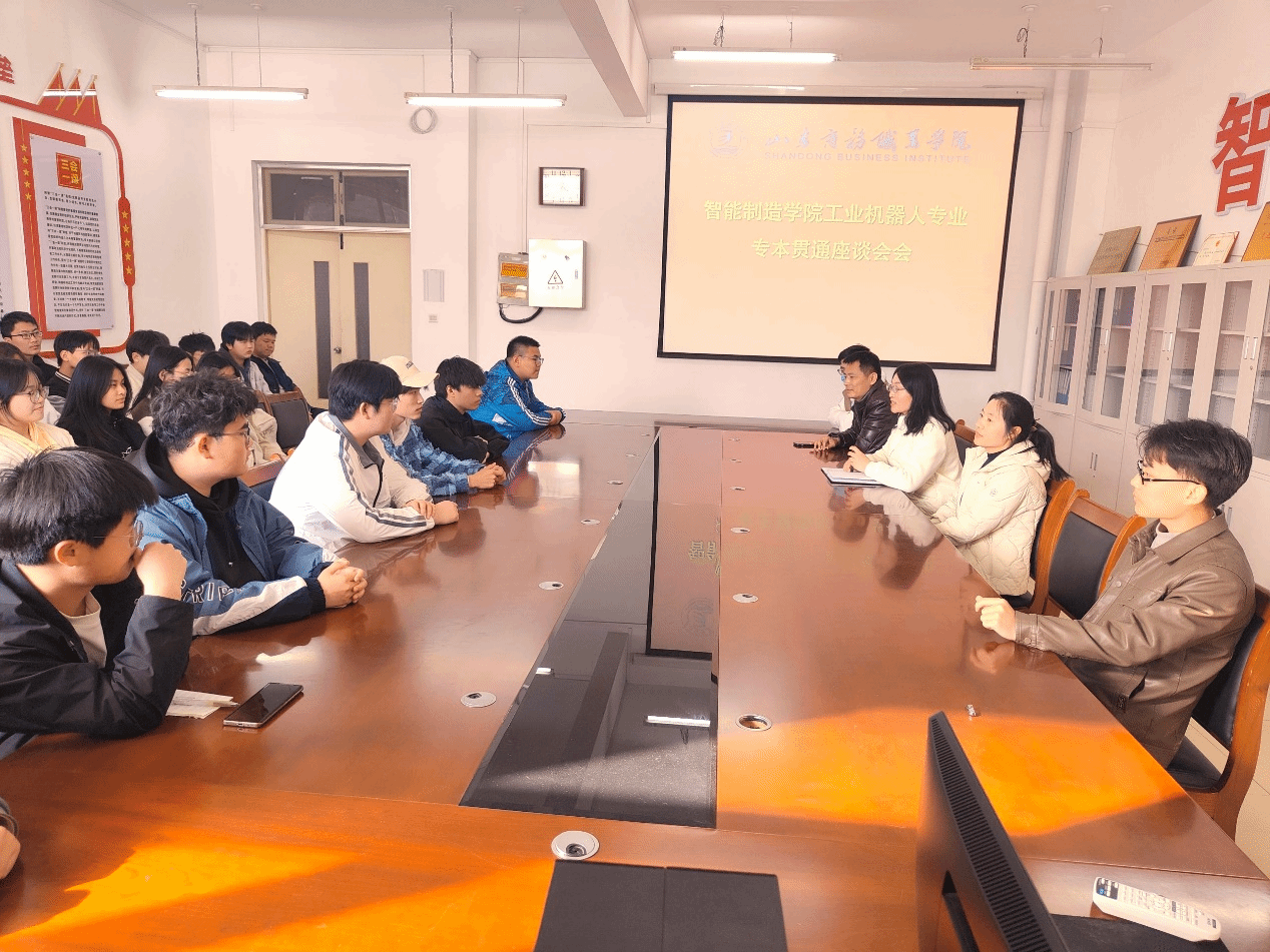 班主任苏老师详细介绍了专本贯通班教学管理情况及本次座谈交流的核心议题。教研室主任李娟系统梳理了专本贯通培养方案的10个学期课程体系,重点介绍了智能电气技术中心的创新育人模式。技术中心实行项目化教学,学生可以通过参与协作机器人协会的实践项目,将理论知识转化为实际操作能力。李娟老师鼓励同学们充分利用课余时间参与科技创新活动,提升就业竞争力。