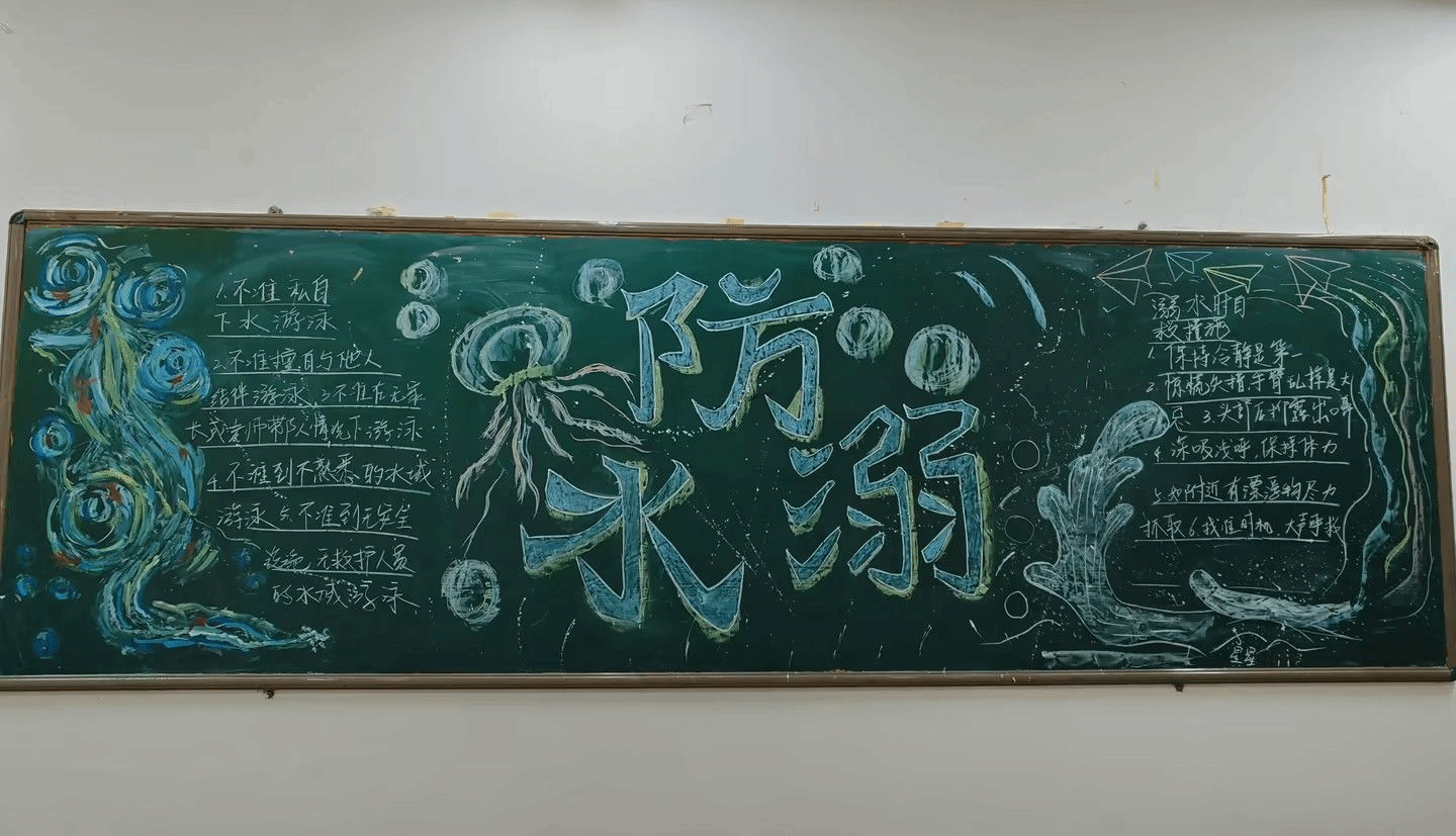 防溺水黑板报,宣传安全知识。开展防溺水主题黑板报评比活动。活动中,各班级积极准备、认真设计,同学们用手中的粉笔表达着对生命的敬畏,对防溺水安全的理解。此次黑板报评比活动,展示了班级风采,真正把防溺水安全教育落到实处,为构建平安校园起到积极的推动作用。