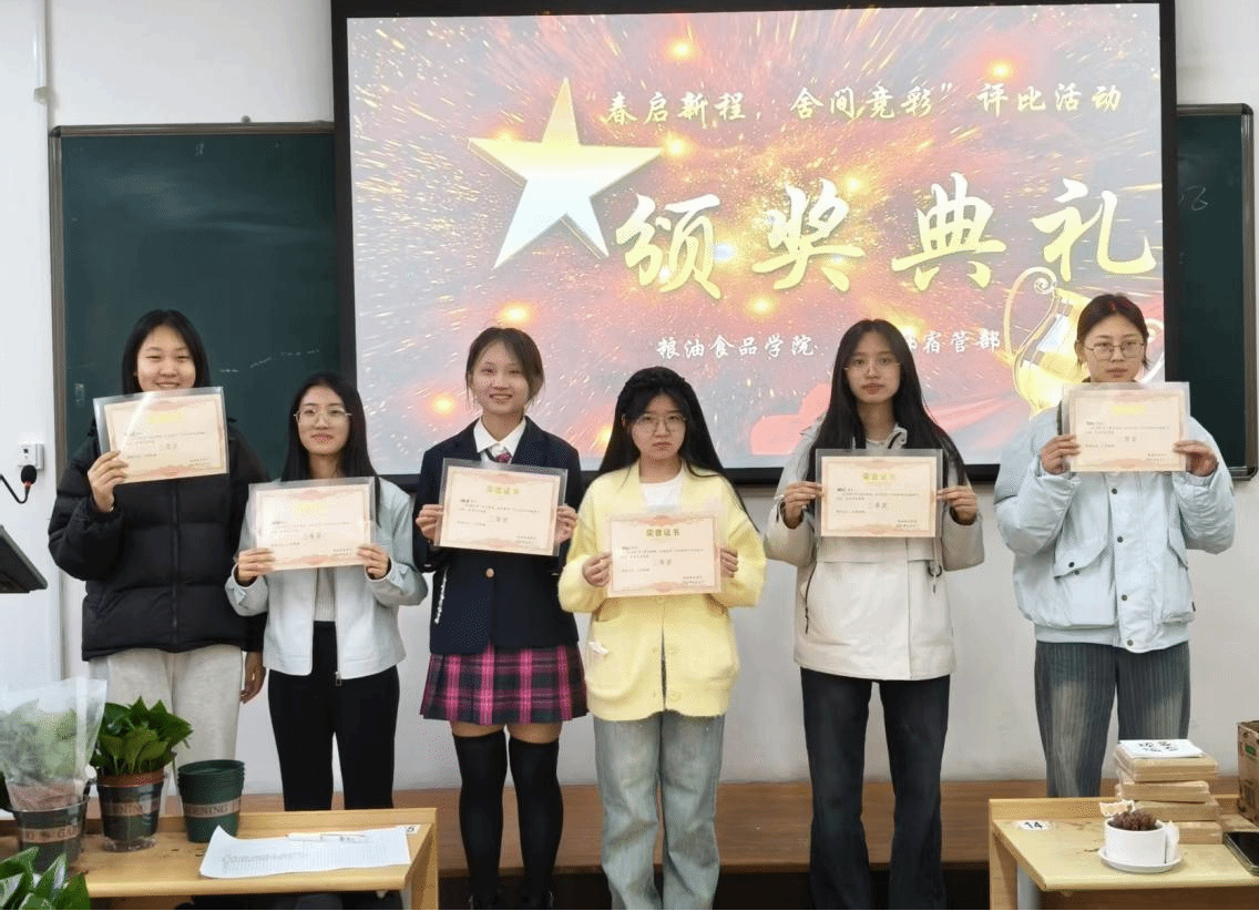 优秀宿舍脱颖而出,展现学生青春风采。活动时间持续一个月,经过综合评定,立信苑B区305室等42个宿舍凭借干净整洁的环境、规范的宿舍用电习惯以及和谐友爱的宿舍氛围,荣获“文明示范宿舍”称号。部分获奖宿舍还通过照片墙、绿植装饰、励志标语等方式,展现了粮院学子积极向上的精神风貌。