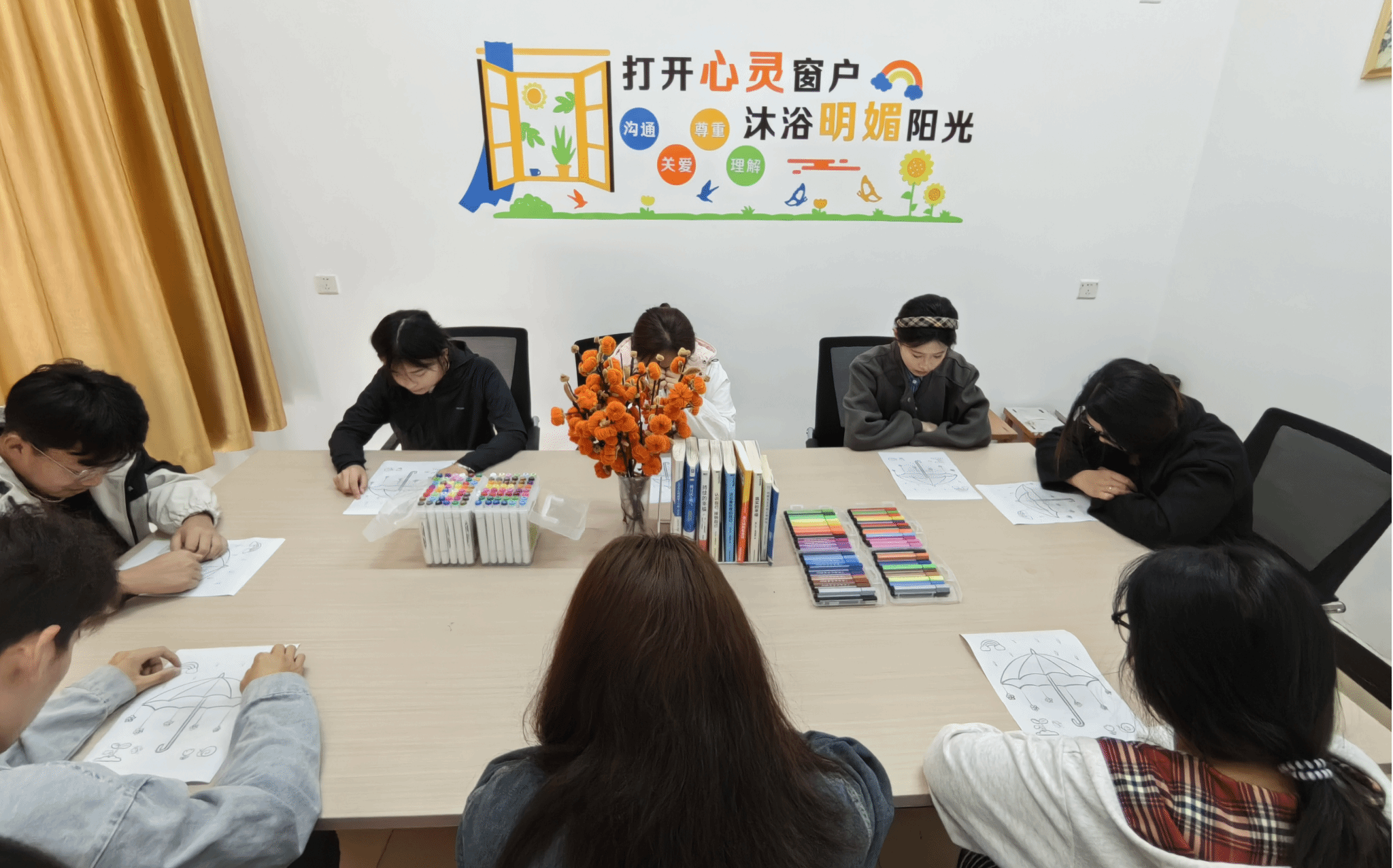 伞外描绘象征压力的乌云或荆棘,伞内则填充代表亲情、友情、梦想的明亮色彩,形成内外情绪的视觉化对比。活动最后,每位参与者对自己的作品进行解读,与大家分享负面情绪案例以及应对经历,在场的其他同学提出自己的建议,大家互相讨论、互帮互助。