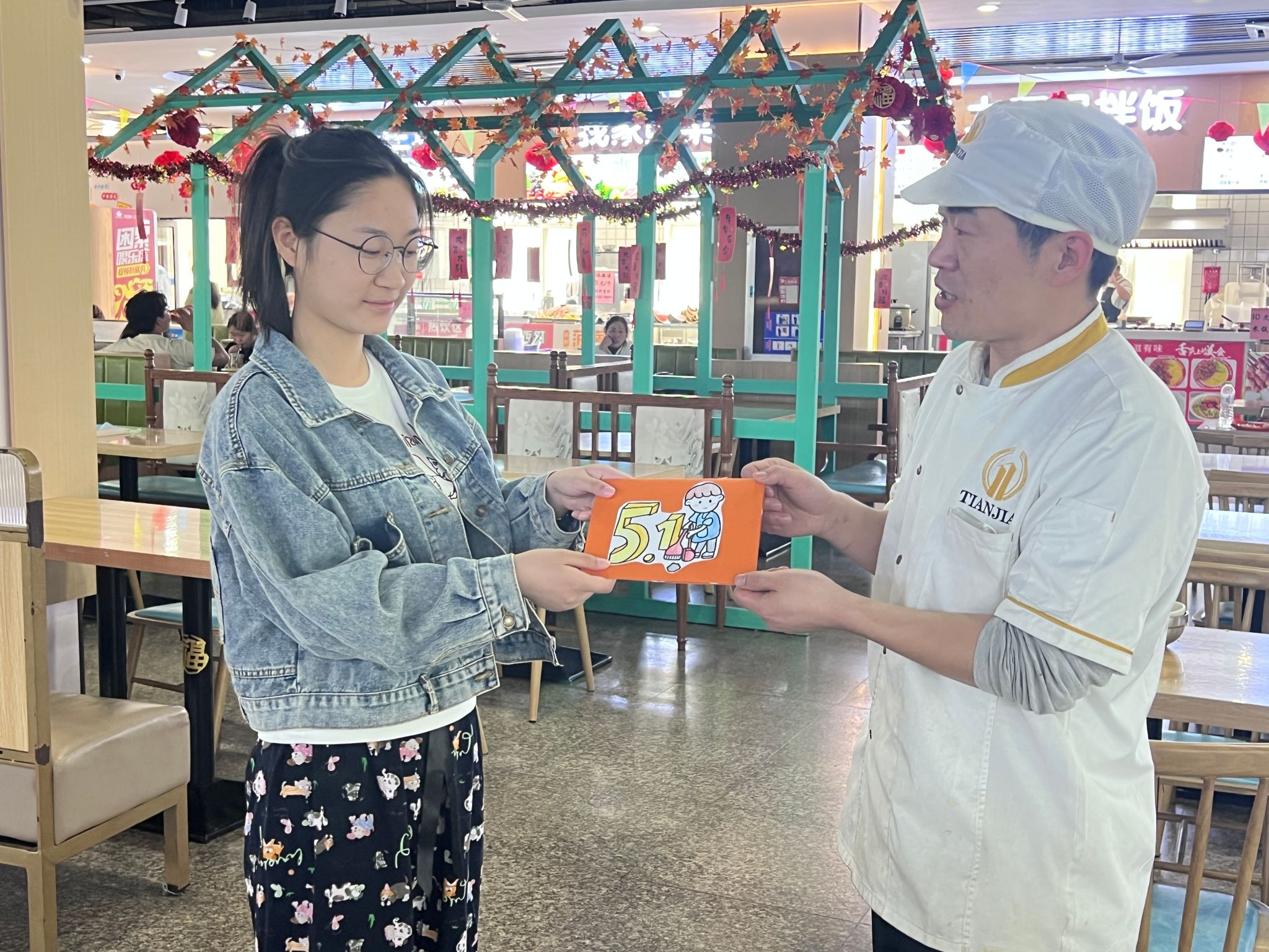 以纸传情,手写千言感恩。“感谢卡”环节成为同学们传递感恩之情的重要平台。同学们充分发挥自己的创意和想象力,自主设计感谢卡,用彩笔、贴纸和干花等元素精心装饰卡片,将平日里羞于说出口的感激之情化作了一封封饱含深情的书信。为了让这份感恩之情能够及时传递到学校的劳动者手中,学生志愿者们组成了“感恩小分队”,他们怀揣着真诚与热情,将感谢卡逐一送到每一位辛勤的劳动者手中。食堂王阿姨收到卡片时,她的脸上洋溢着幸福的笑容,激动地说:“孩子们的字写得这么漂亮,话也说得这么贴心,再累都值了!”