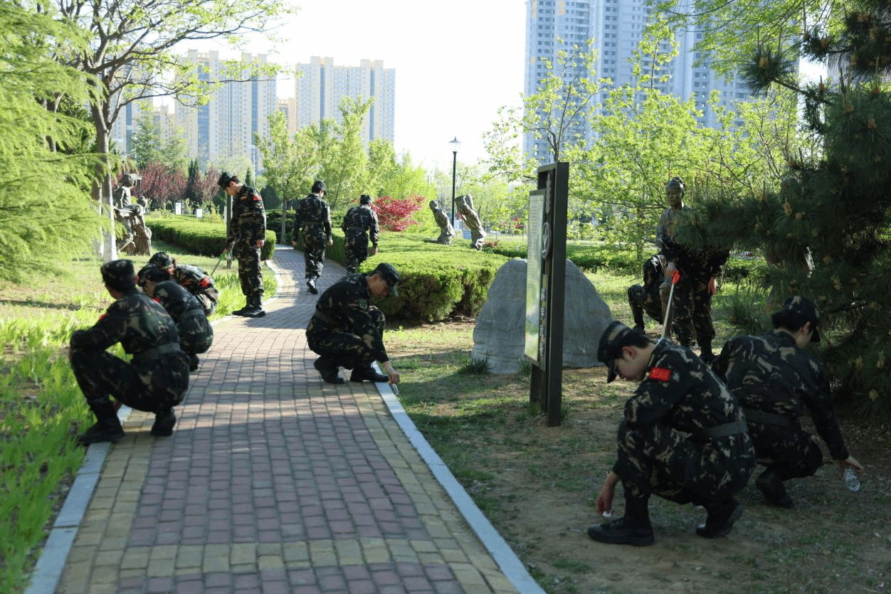 晨光熹微中,队员们身着笔挺的迷彩服,携带清洁工具在国旗广场整齐列队。随着一声令下,大家分组深入校园主干道、操场、绿化带、宿舍楼周边等区域,俯身捡拾烟头、纸屑、塑料瓶等,细致清理卫生死角,并对垃圾进行分类处理。烈日下,队员们的衣衫逐渐被汗水浸透,但始终保持着严谨的纪律性和高昂的热情,弯腰清扫的身影、认真分类的动作,既是对劳动的尊重,更是对“奉献精神”的生动诠释。