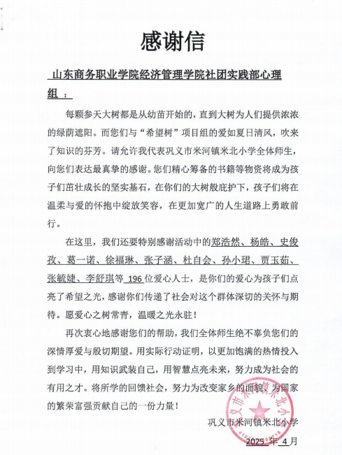 本站讯 近日,经济管理学院收到来自巩义市米河镇米北小学的感谢信,对学院同学们捐赠书籍、文具等爱心物资表示感谢。