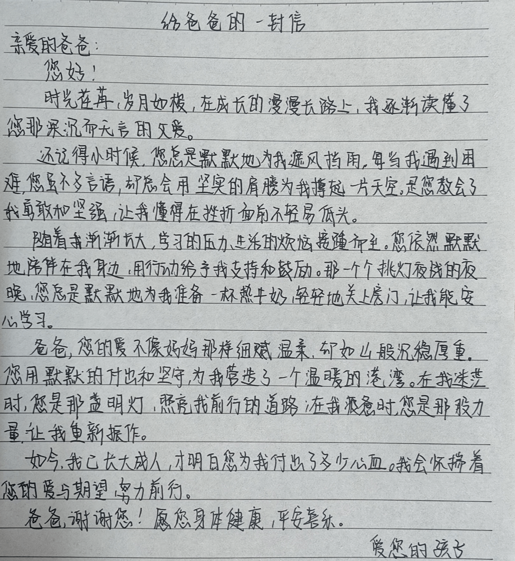 据悉,本次活动评选出的优秀作品将通过学院官方微信公众号进行专题展示,部分书信还将由学院统一寄送至学生家长手中,为父亲们送上一份特别的节日惊喜。活动不仅营造了浓厚的感恩氛围,更深化了家校协同育人理念,获得了师生的一致好评。