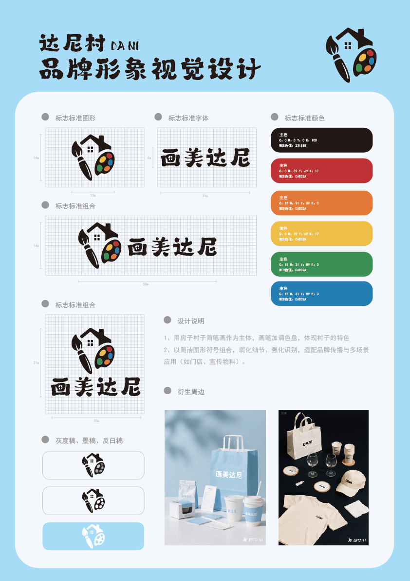 为提升达尼村文旅吸引力,团队设计村级IP形象“莓小粒”(以当地蓝莓产业为灵感),应用于导览标识、纪念品等场景;同时优化美术馆、艺术街区等公共空间的导视系统,设计统一风格的指示牌与地图手册。指导教师唐玮指出:“视觉系统的升级不仅能提升游客体验,更能强化达尼村作为艺术村落的品牌辨识度。”