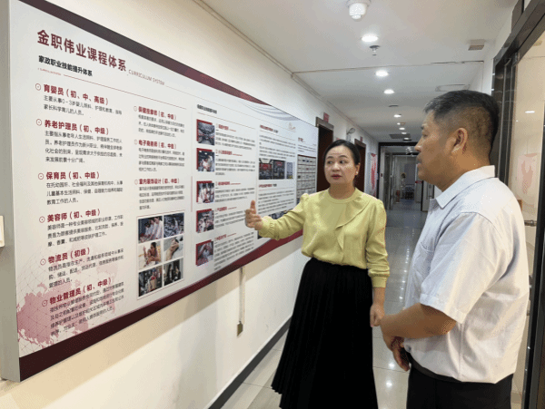 考察期间,在金职伟业集团团队的引导下,宫国学一行先后深入参观了集团总部的运营中心、教研基地,详细了解了企业的发展历程、核心业务板块及技术研发实力。随后,考察团前往长沙市雨花区托育综合服务中心,实地察看了托育机构的日常运营模式、师资配备及婴幼儿照护服务流程,对其标准化的服务体系和专业化的运营管理给予了高度评价。此外,考察团还走访了现代家庭服务产教融合实践中心及全国婴幼儿照护服务产教融合共同体,通过现场观摩、设备体验、座谈交流等方式,全面了解了金职伟业在产教融合实践中的创新举措、实训基地建设经验以及人才培养与产业需求对接的具体做法。