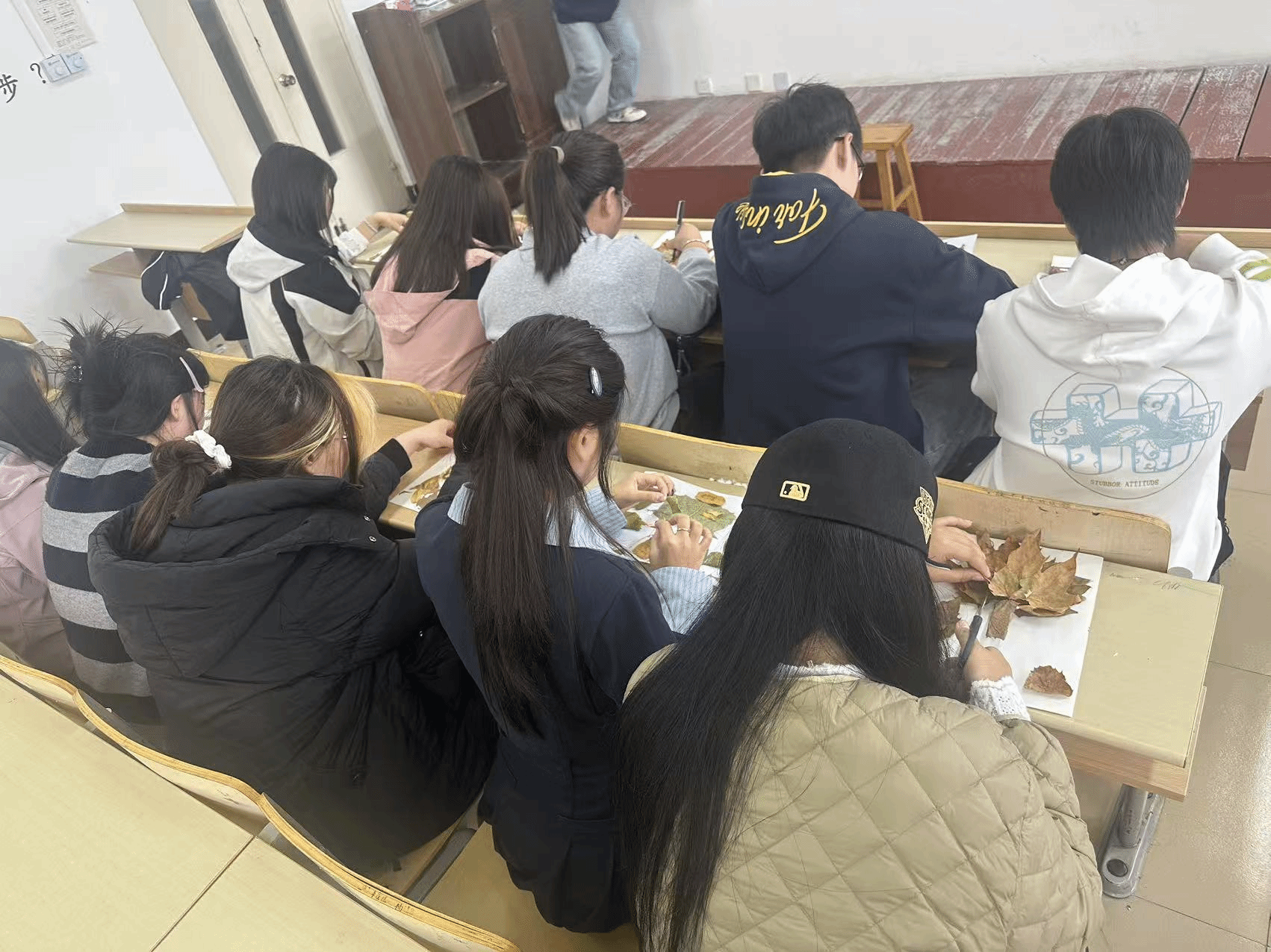 活动当天,秋阳正好,学院操场上铺满了金黄的银杏叶、火红的枫叶与形态各异的落叶。参与活动的同学们以小组为单位,首先开启“落叶采集与心灵对话”环节。在心理辅导老师的引导下,同学们一边捡拾心仪的落叶,一边分享近期的心理状态。有新生提及初入大学面对陌生环境与学业压力的迷茫,有高年级同学谈到对未来规划的焦虑与“躺平”念头的偶尔浮现。辅导老师借此契机,针对同学们普遍存在的适应压力、目标缺失、情绪内耗等问题进行分析,精准触碰大学生“躺平”现象背后的心理动因—如环境适应障碍引发的自我怀疑、压力积累导致的动力消退、自我认知模糊带来的方向迷失等,这正与课题中对“躺平”现象心理动因的调研方向高度契合。