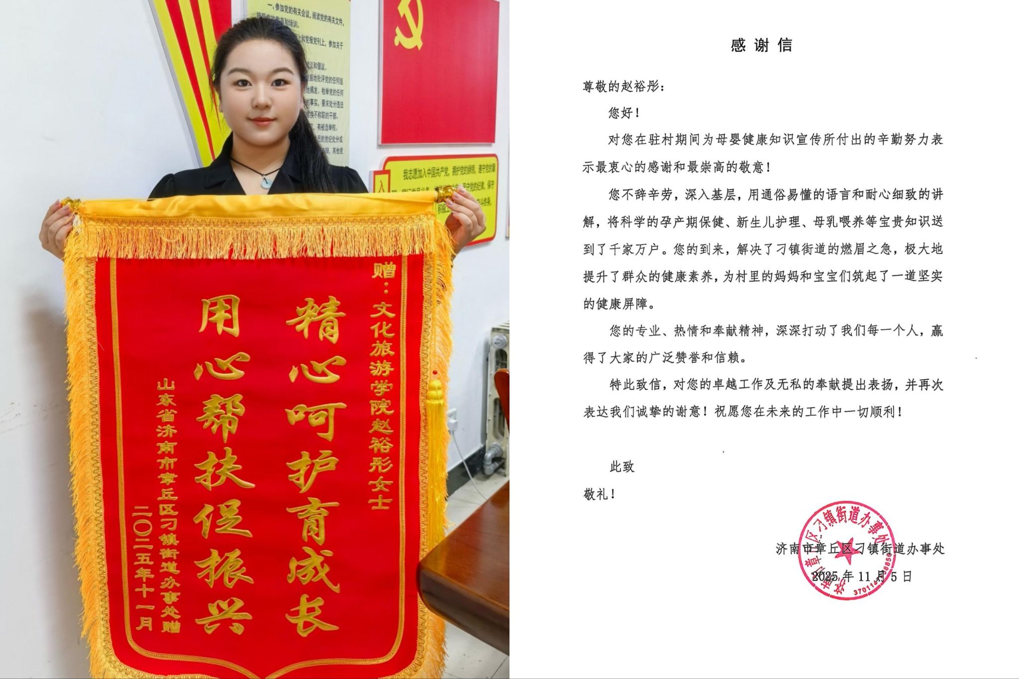 本站讯 近日,济南市章丘区刁镇街道办事处致信我校,对文化旅游学院学生赵裕彤在驻村服务期间的突出表现予以高度赞扬,并对学校在乡村振兴、基层治理工作中给予的支持表示衷心感谢。