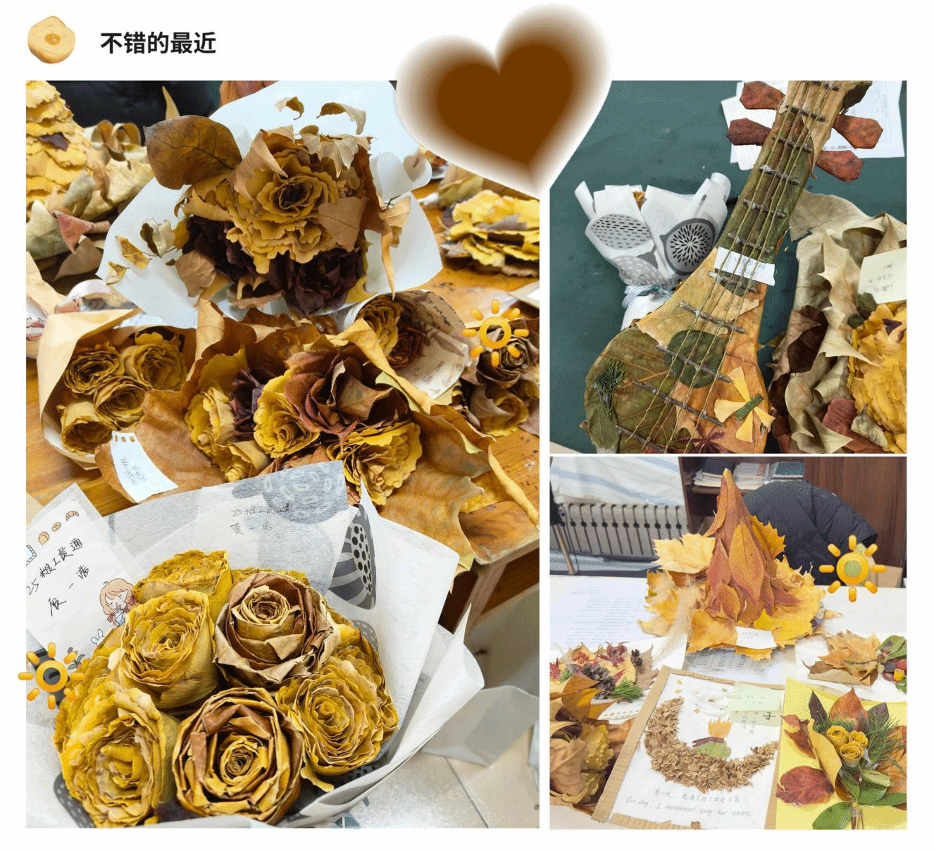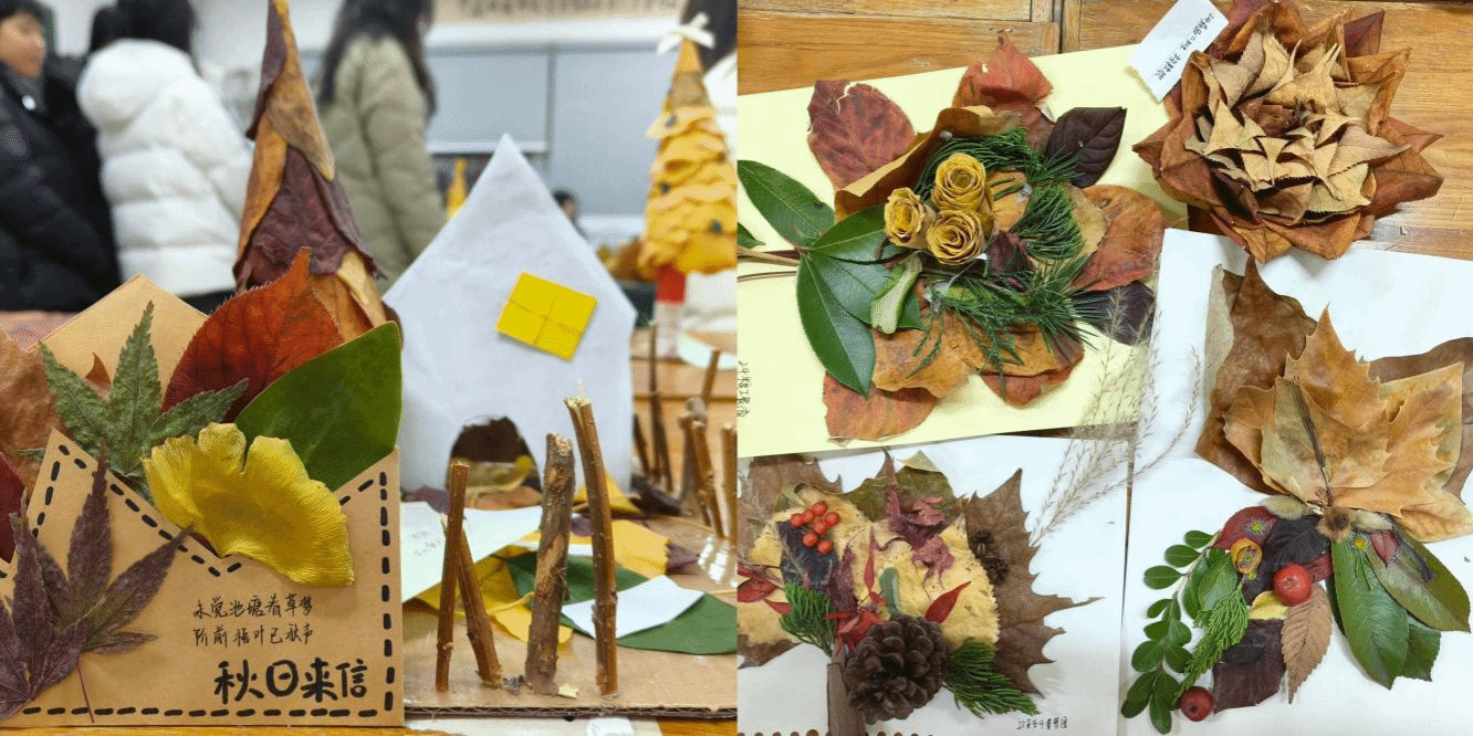 “秋风起,落叶归,一草一木皆美好。”活动期间,同学们化身“自然艺术家”,将校园里散落的各类落叶变废为宝,用巧思与双手赋予落叶全新的生命。大家围坐一堂,互相借鉴创意、分享技巧,有的同学将银杏叶层层叠卷,制作成娇艳的玫瑰捧花,金黄的叶片在指尖舒展,定格了深秋的温柔;有的同学以梧桐叶为基底,拼粘出小巧的圣诞树,点缀红果与彩绳,让秋日落叶与创意碰撞出别样趣味;还有的同学将不同颜色的落叶裁剪拼接,做成惟妙惟肖的琵琶摆件、精致的秋日花环,或是拼贴出校园风景、励志标语等立体作品,每一件作品都饱含着对自然的观察与热爱。从捡拾落叶、筛选材料,到构思设计、粘拼成型,同学们沉浸在创作的专注中,不仅锻炼了观察力、想象力与动手能力,更在与自然对话、与同伴互动的过程中,释放了学业与生活的压力,学会发现平凡事物中的美,感受到了集体的温暖。正如不少同学所言:“原来不起眼的落叶能这么美,既保护了环境,又在创作中放松了心情,还认识了志同道合的朋友,这种互助相伴的快乐,让我更有勇气面对困难,这是课堂上学不到的收获。”