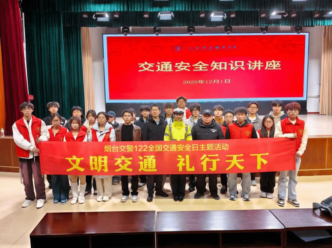 本站讯 为切实增强在校大学生交通安全意识,有效防范各类出行安全风险,在第十四个全国交通安全日来临之际,12月1日,信息工程学院联合学生工作处(团委)共同举办“筑牢出行防线 护航平安校园”交通安全专题讲座。讲座以“法治警示+知识普及+出行安全”三位一体模式,创新交通安全教育形式,为在校学子全面普及交通安全知识,筑牢出行安全屏障。烟台交警支队第五大队民警宋先媛受邀担任主讲嘉宾,学生工作处(团委)学生管理科科长闻文、信息工程学院副院长栾岭雪,各二级学院辅导员及学生代表共计600余人参加活动。